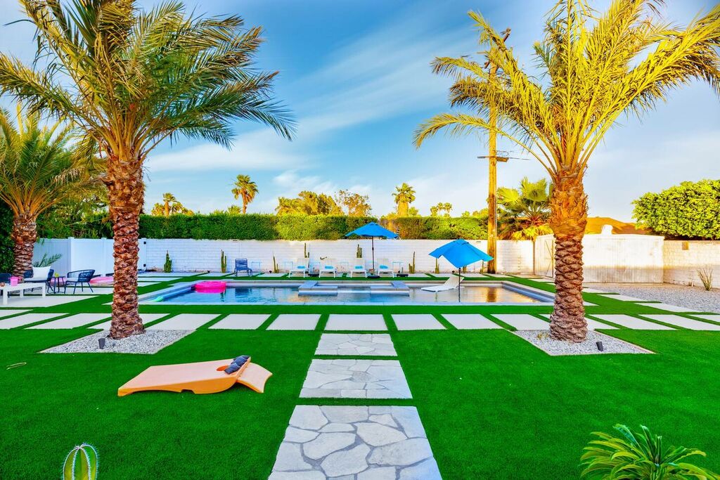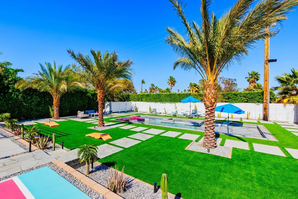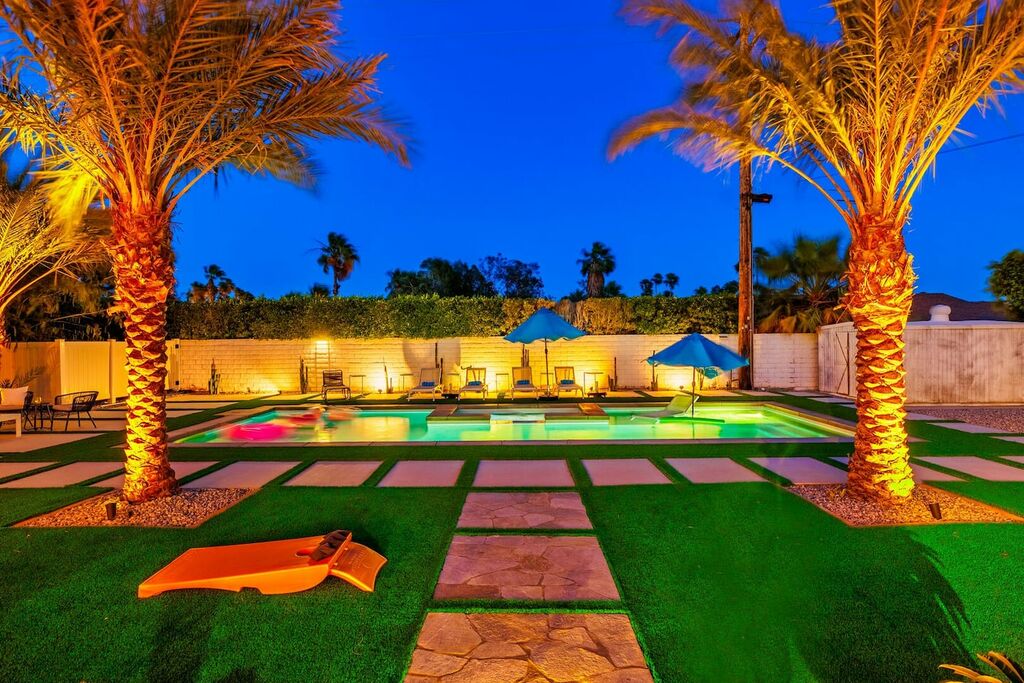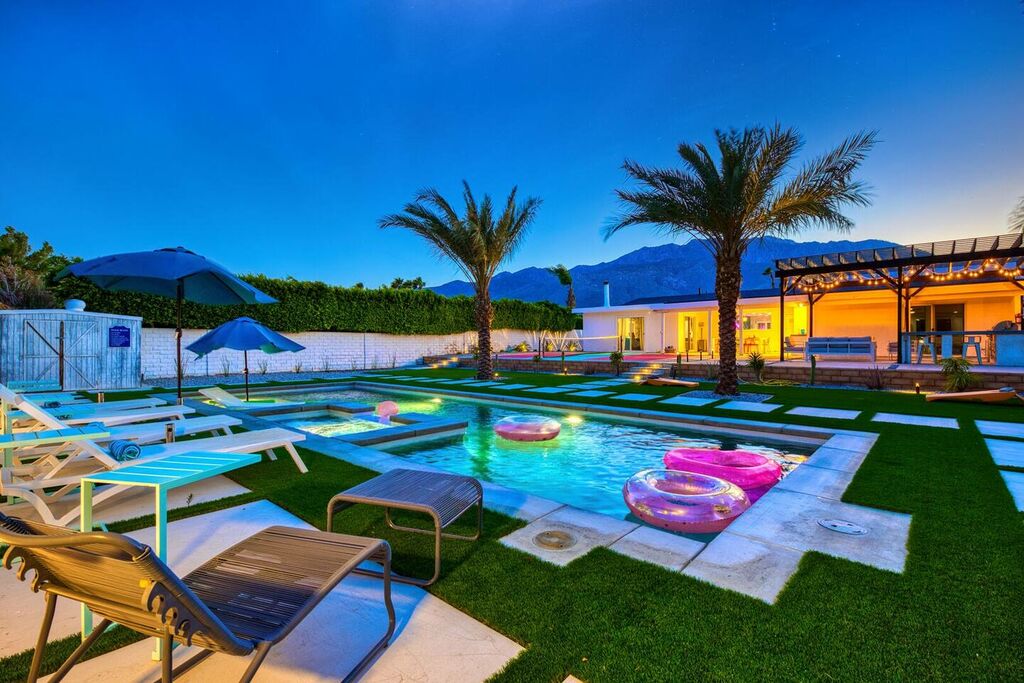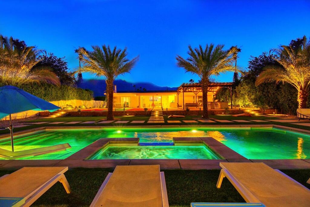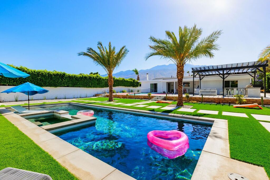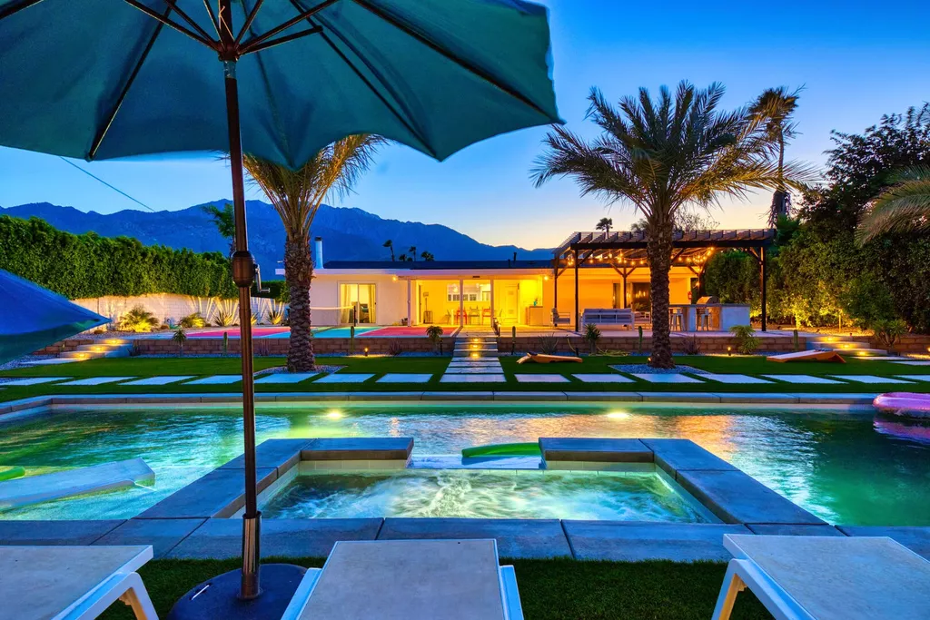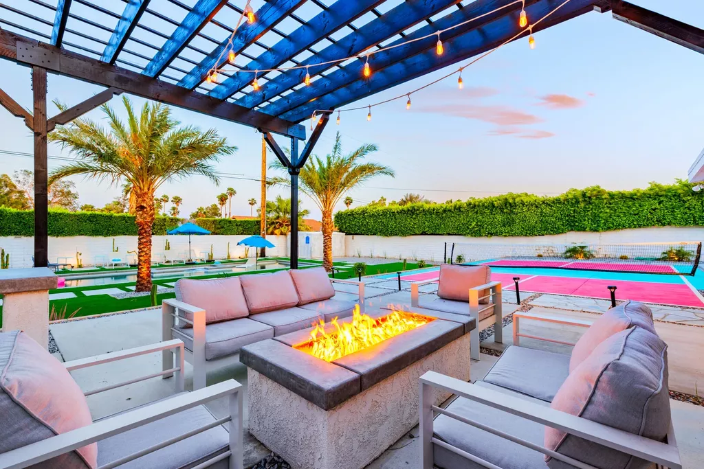 Welcome to Palm Springs! This exquisite 4-bedroom, 3-bath (plus 1 outdoor shower!) ‘Pickleball Haus’ offers an unparalleled experience of comfort, elegance, and recreation. Nestled in a serene location, this property is the epitome of relaxation, boasting a private pickleball court, an expansive pool with built-in hot tub and Baja shelf, and outdoor seating areas designed for ultimate relaxation and entertainment.