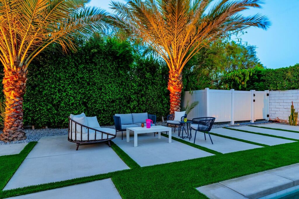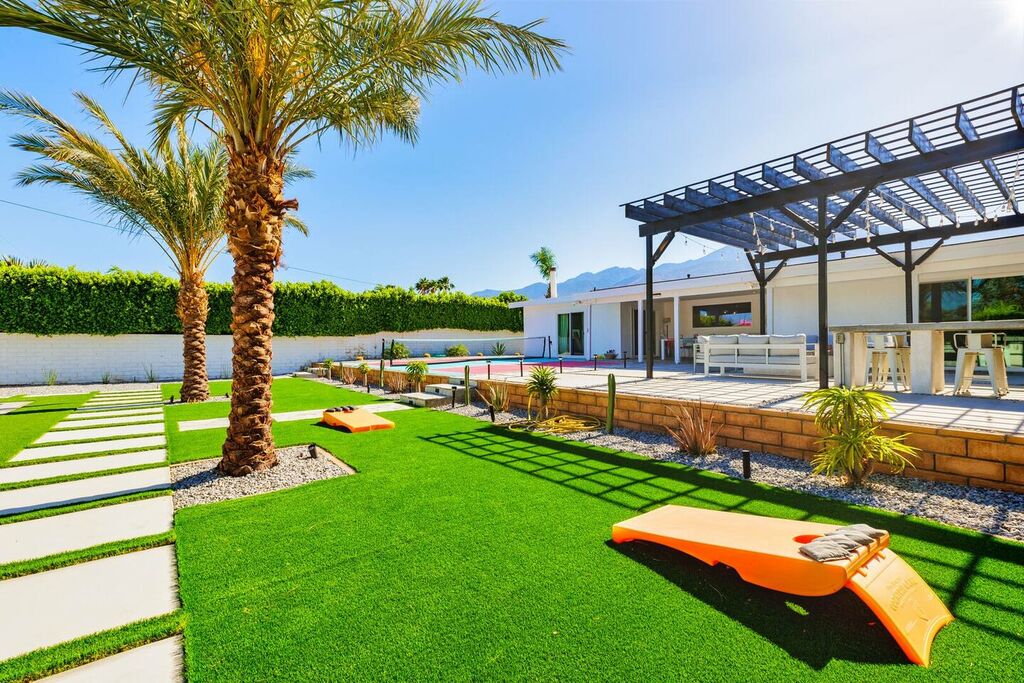 For those seeking a quiet retreat, the outdoor seating areas are perfect for unwinding and taking in the picturesque views of the San Jacinto Mountains. Relax on plush sofas, gather around the fire pit on cool evenings, or savor a delicious meal al fresco at the outdoor dining table. For the grilling aficionados, a gorgeous Bull BBQ awaits, complete with outdoor kitchen island and mini fridge.The well-manicured landscaping enhances the ambiance, creating a sense of tranquility and privacy.