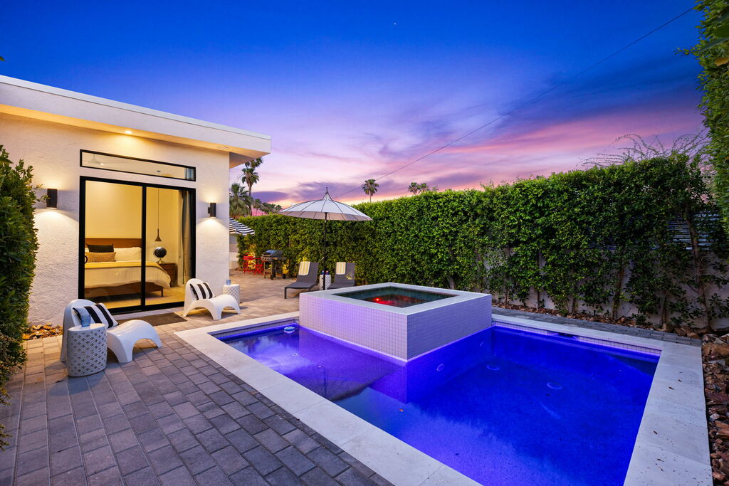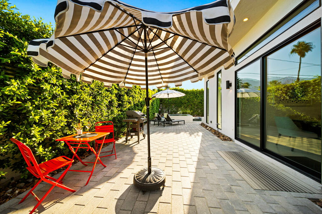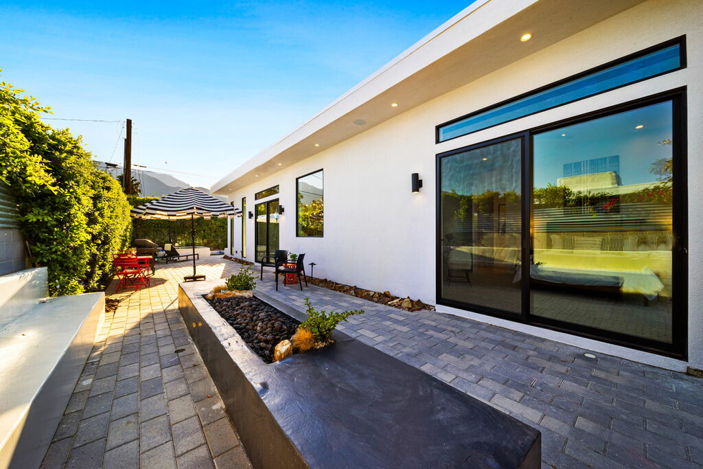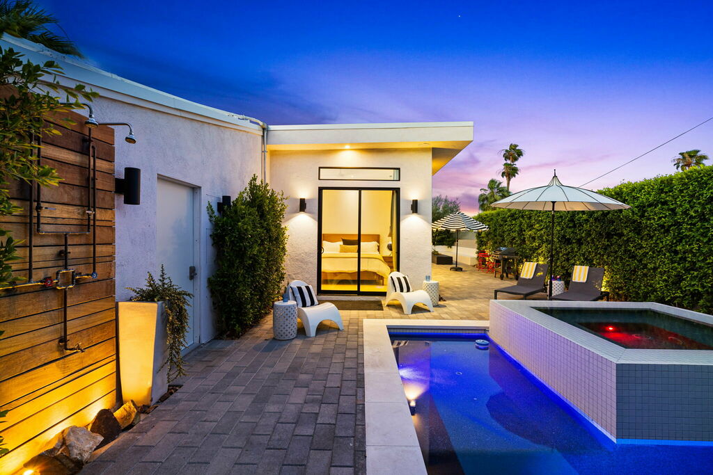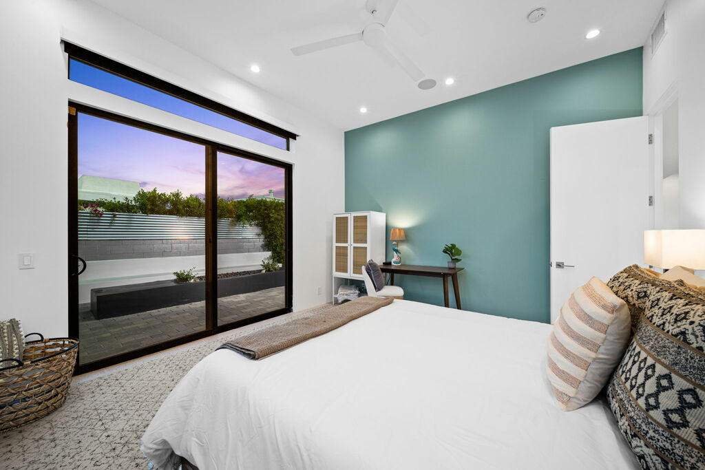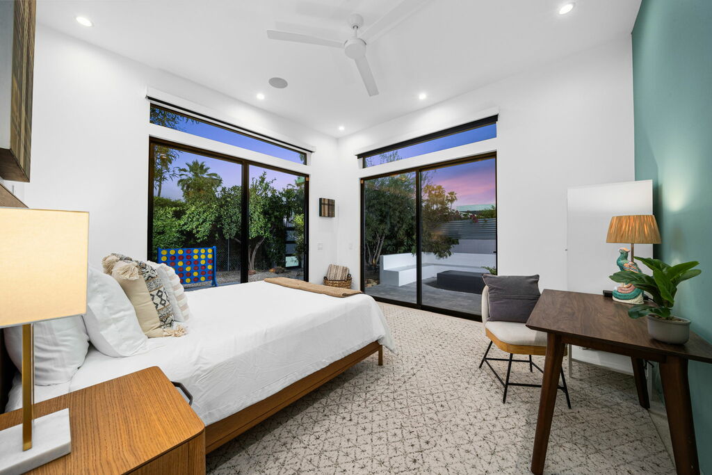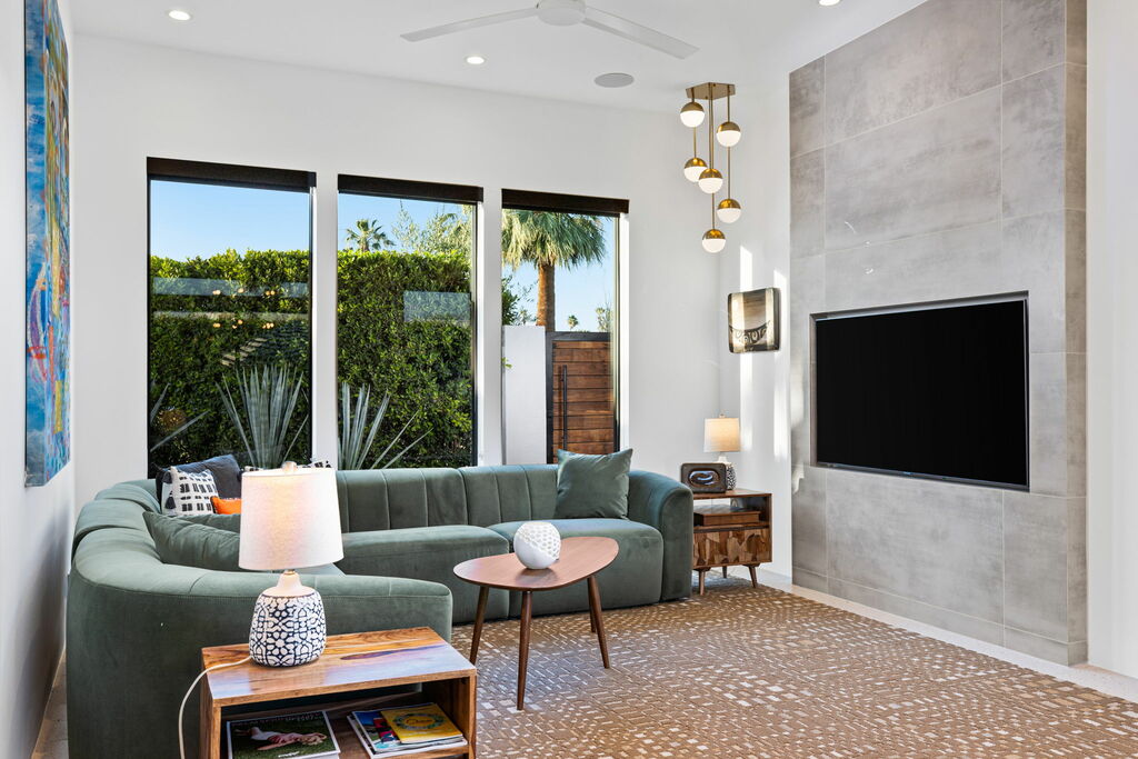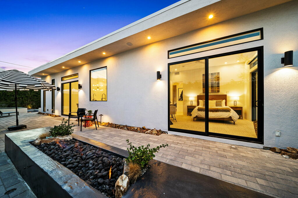 Welcome to your serene retreat, a sun-drenched haven featuring high ceilings and expansive picture windows framing breathtaking blue-sky and mountain vistas. Immerse yourself in a space adorned with original artwork, equipped with high-speed internet, premium linens, and a fully stocked kitchen. Step outside to enjoy a generous seating area with a built-in fire pit, a tranquil garden, sun loungers, and a combination saline pool and spa.