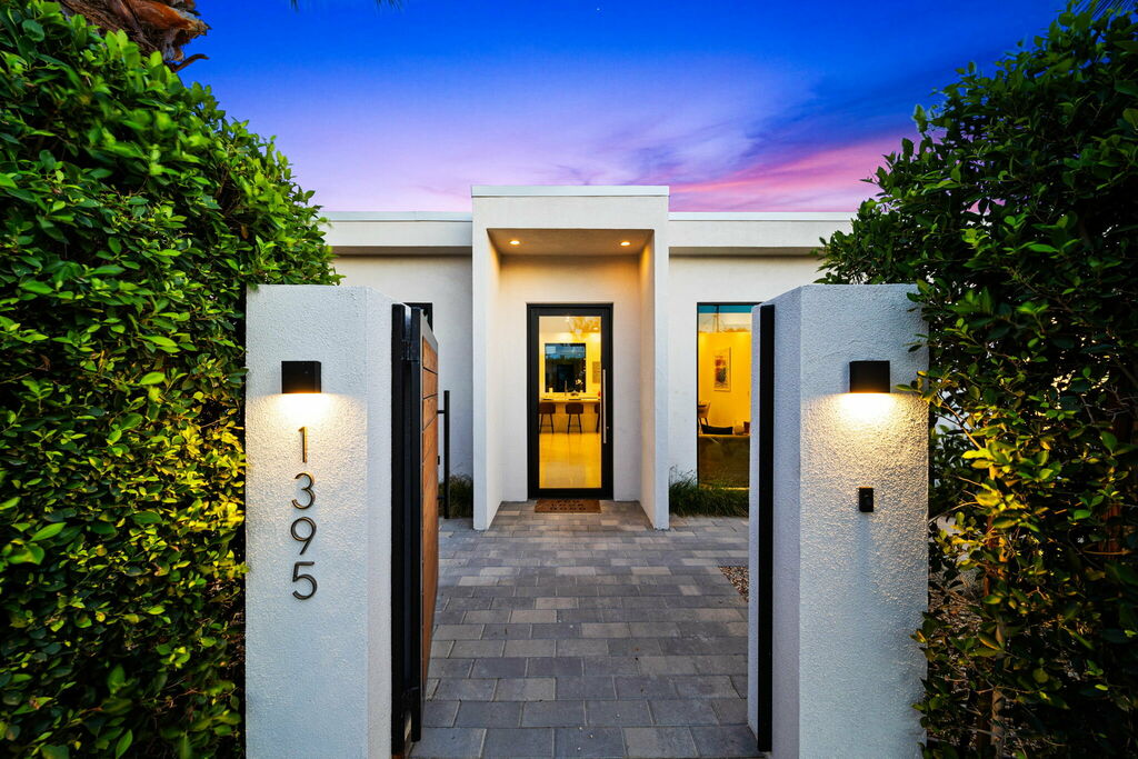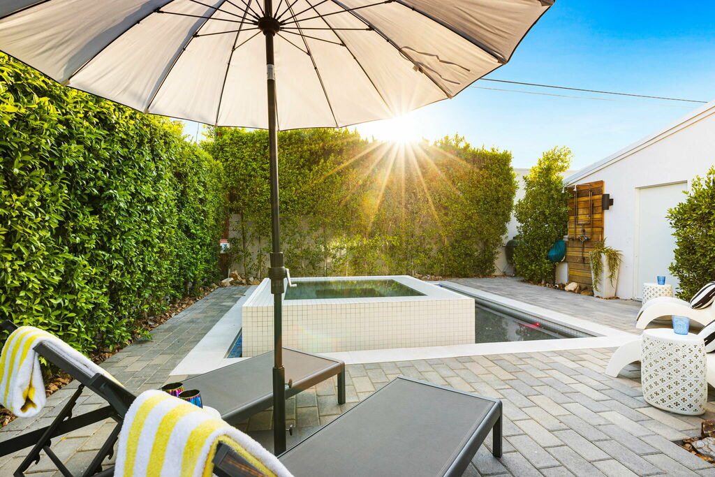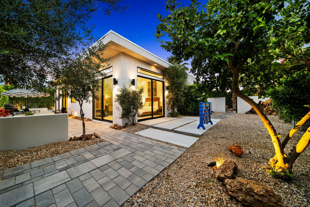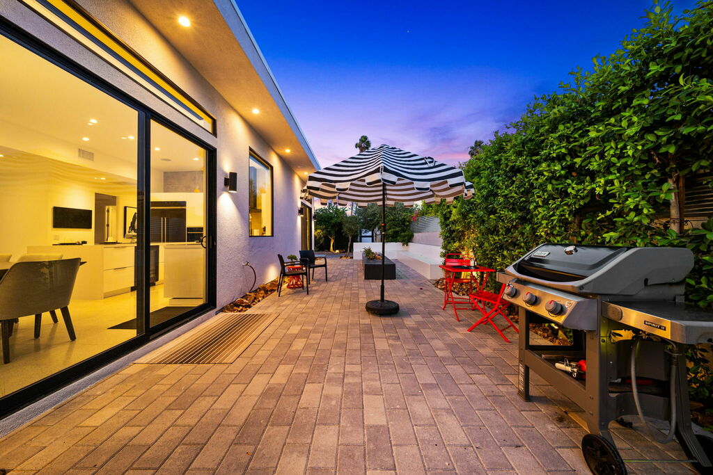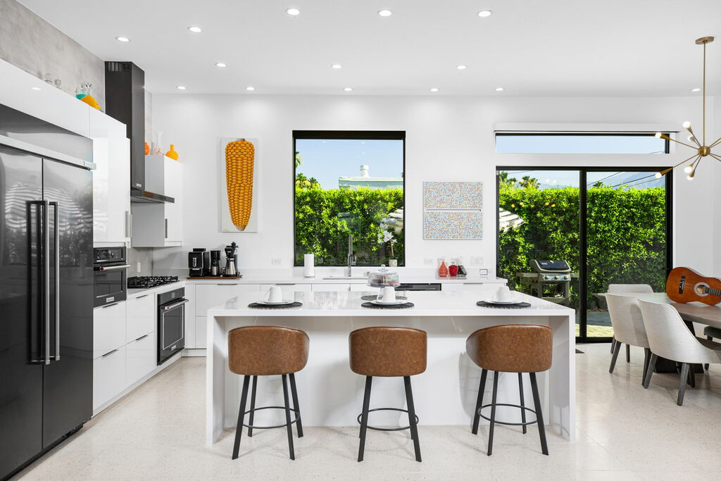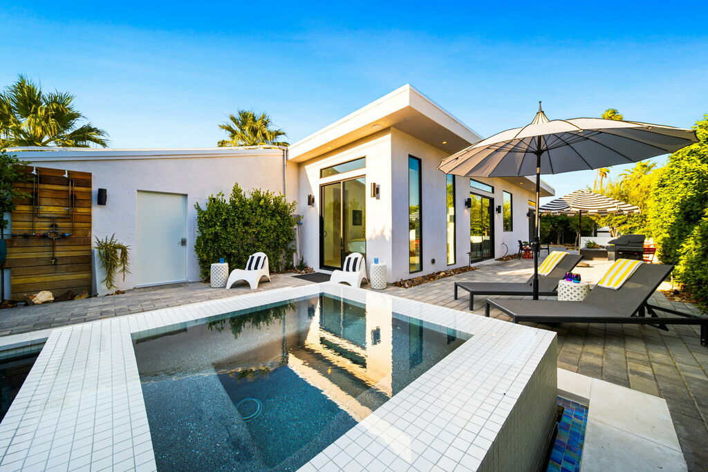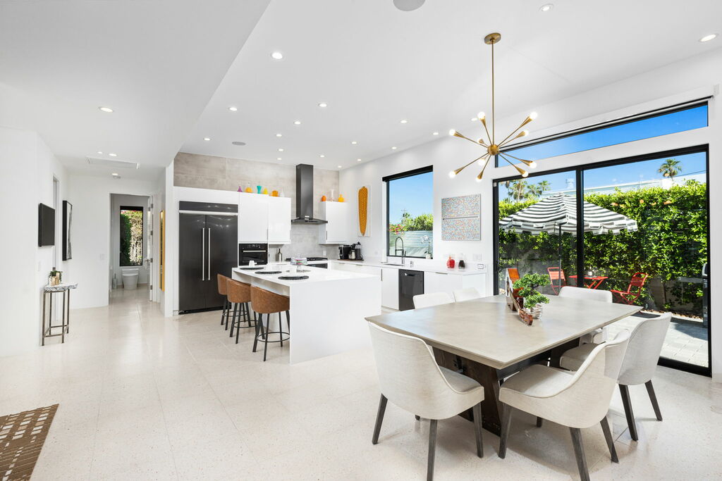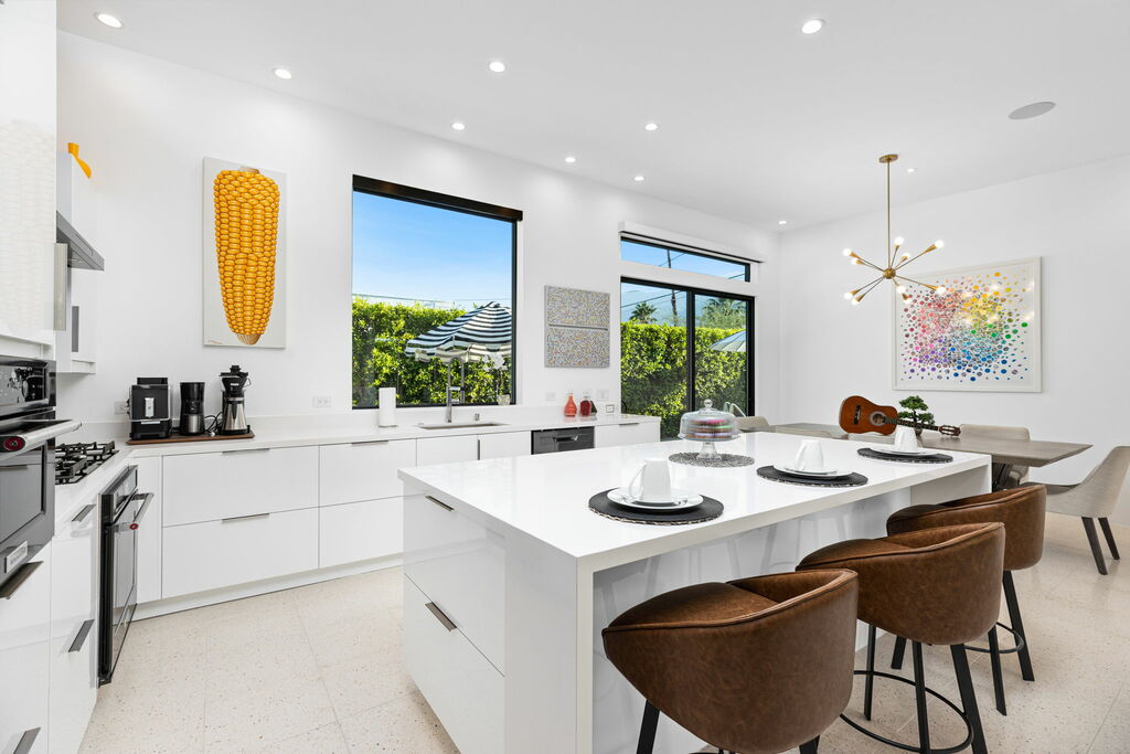 Welcome to your serene retreat, a sun-drenched haven featuring high ceilings and expansive picture windows framing breathtaking blue-sky and mountain vistas. Immerse yourself in a space adorned with original artwork, equipped with high-speed internet, premium linens, and a fully stocked kitchen. Step outside to enjoy a generous seating area with a built-in fire pit, a tranquil garden, sun loungers, and a combination saline pool and spa.
