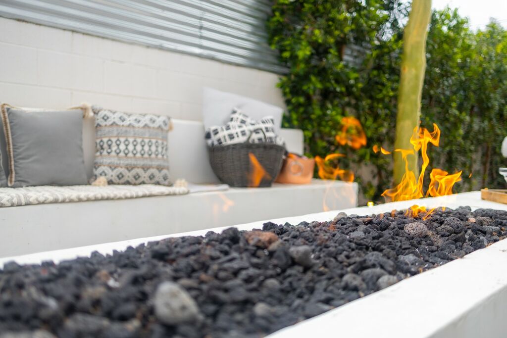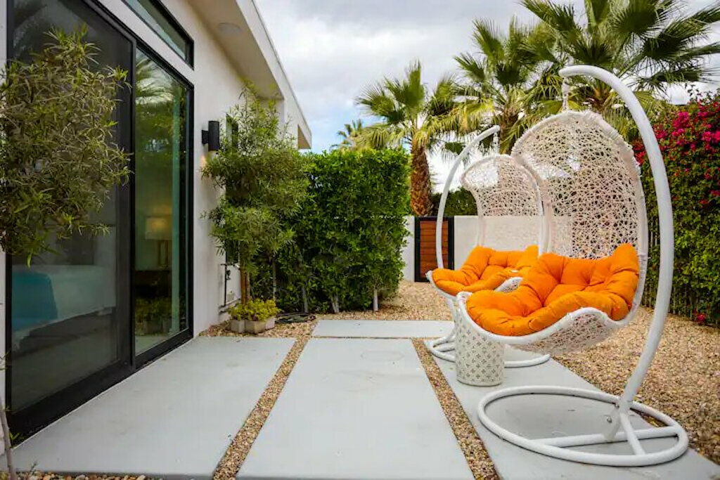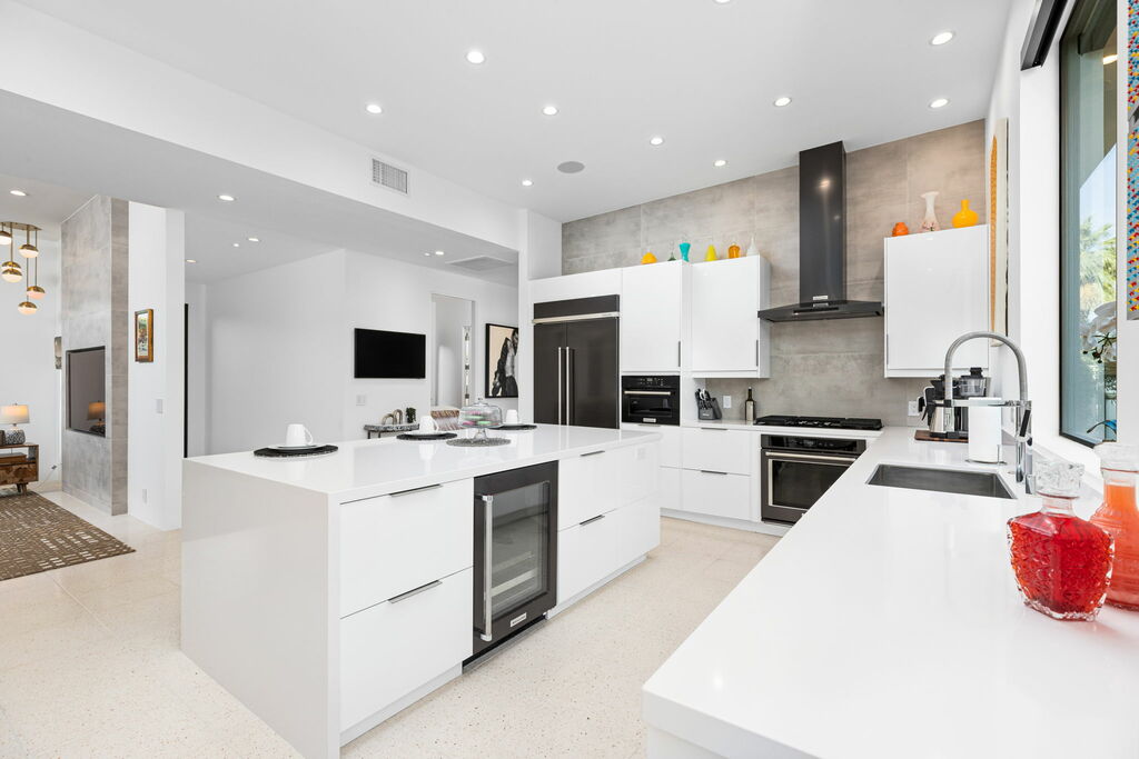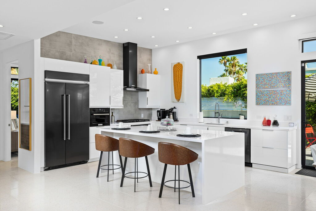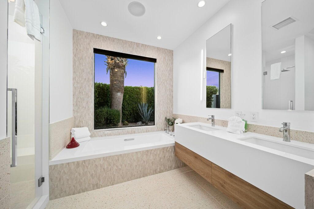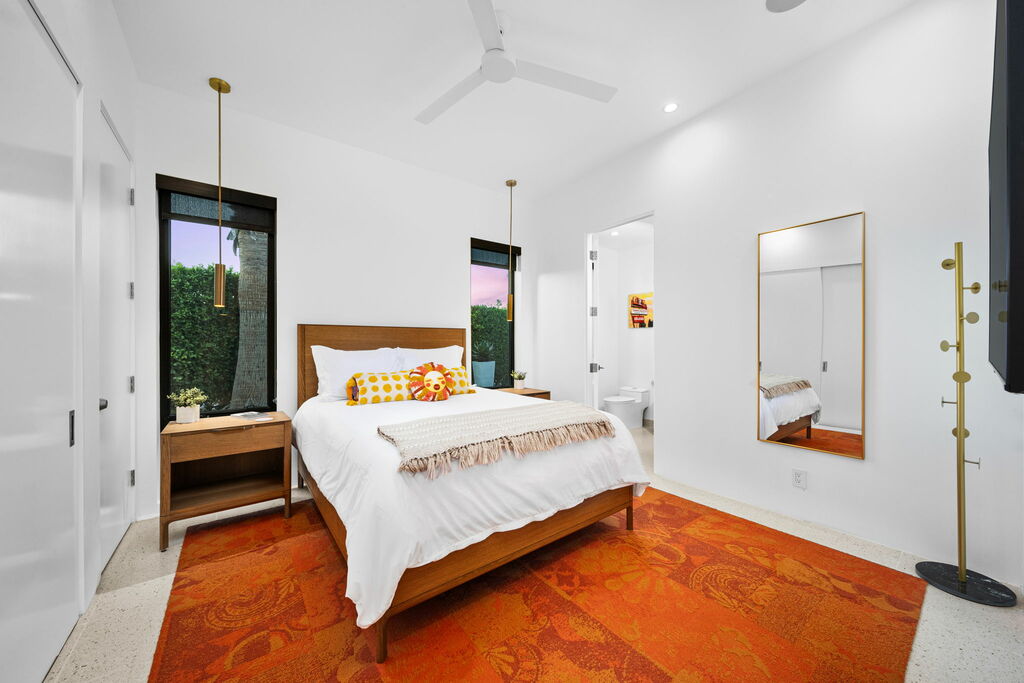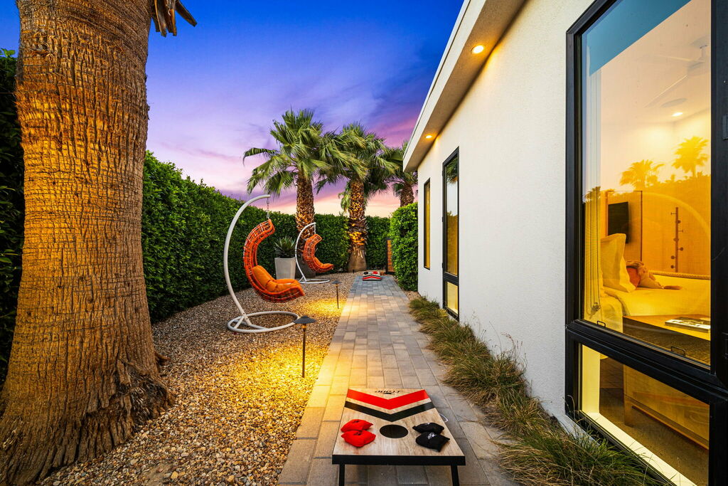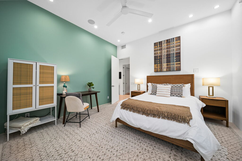 Welcome to your serene retreat, a sun-drenched haven featuring high ceilings and expansive picture windows framing breathtaking blue-sky and mountain vistas. Immerse yourself in a space adorned with original artwork, equipped with high-speed internet, premium linens, and a fully stocked kitchen. Step outside to enjoy a generous seating area with a built-in fire pit, a tranquil garden, sun loungers, and a combination saline pool and spa.