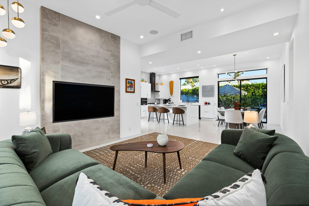The cozy living room features a large sectional sofa and a big flat-screen TV with access to Netflix, Hulu, and other streaming services. Enjoy seamless connectivity with high-speed wireless internet throughout the home.