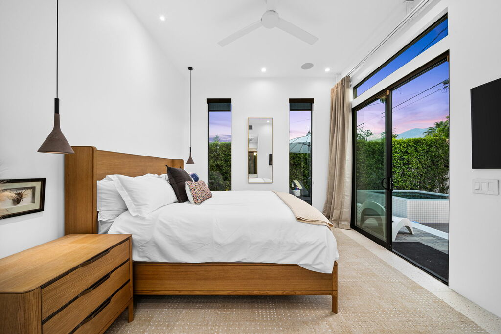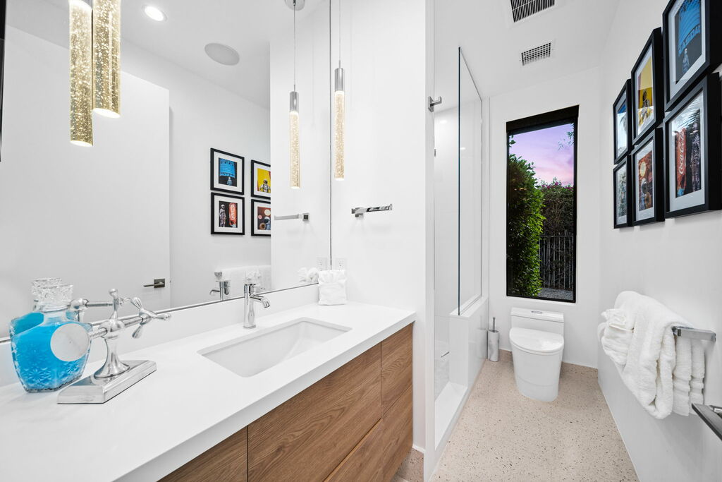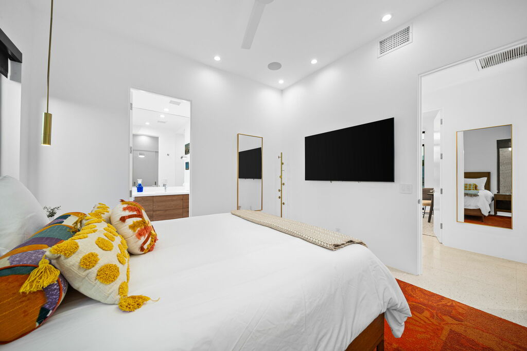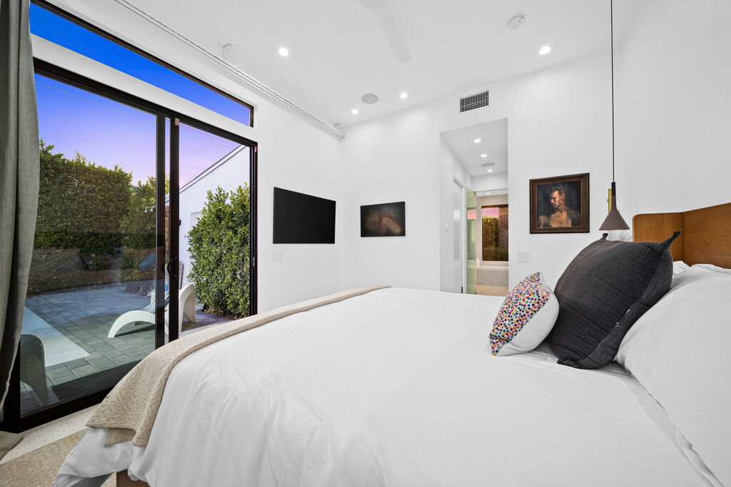 This bright and airy home boasts three spacious bedrooms and three modern bathrooms. The primary suite offers a luxurious Duxiana California King bed and an ensuite bathroom. Two additional bedrooms each feature queen-sized beds; the second bedroom has its own ensuite three-quarter bath, while the third shares a common three-quarter bath. Each bathroom is equipped with rainfall showers and hand wands for a spa-like experience. TVs are available in the primary and second bedrooms for your entertainment.