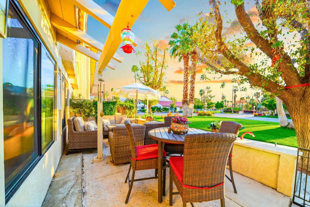 One of the standout features is the spacious and private front lawn—rare for this community. It’s perfect for lounging or playing with provided lawn games, new pickleball gear, and classic board games tucked under the living room TV. A croquet set is coming soon, making it even more ideal for families or groups looking for laid-back fun. Just off the carport, you’ll find a nearby community pool for quick dips, plus a backyard patio area with golf course and mountain views, a firepit, BBQ grill, and seating for dining or relaxing outdoors.