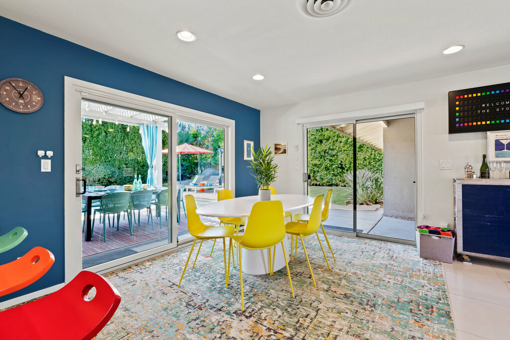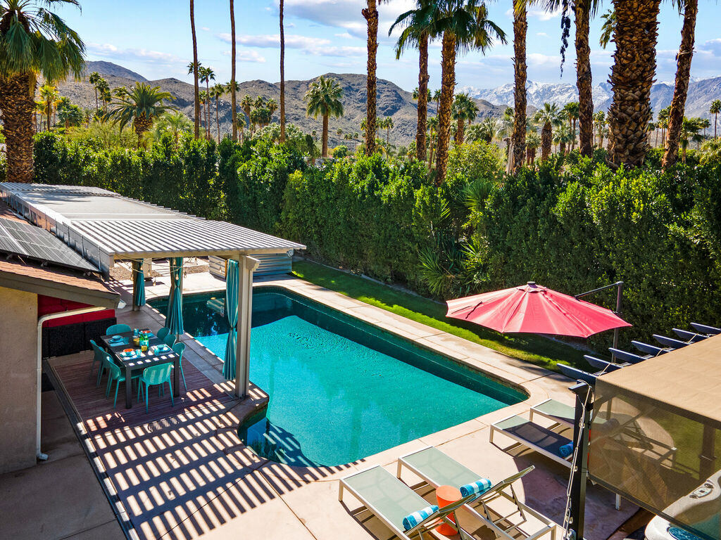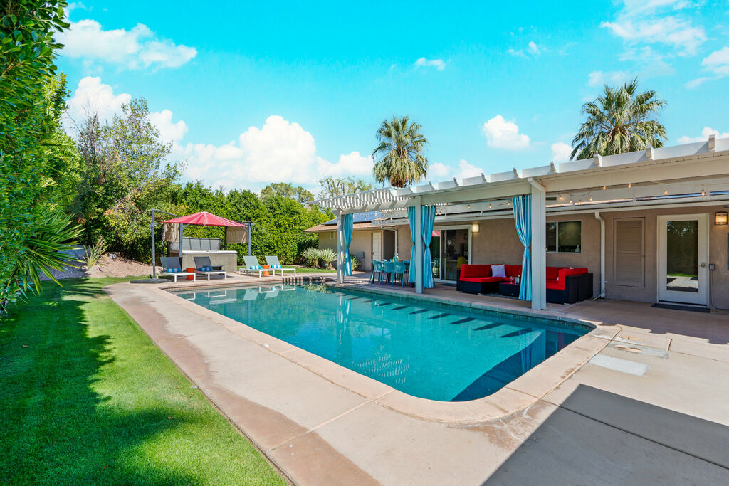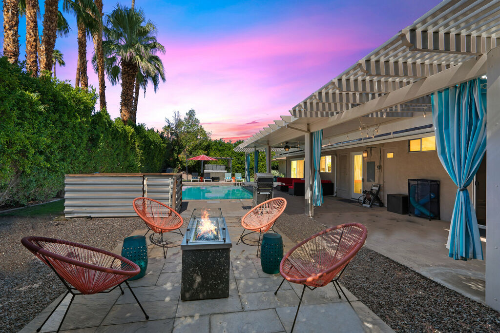 The property boasts a meticulously designed interior that captures the essence of mid-century aesthetics while offering modern conveniences. Step into the backyard, and discover a private sanctuary that defines relaxation. The outdoor haven features a pristine pool, hot tub, al fresco dining area, and multiple lounging zones where you can bask in the desert sun or enjoy a tranquil evening under the stars. A gas grill stands ready for those who wish to showcase their culinary skills.