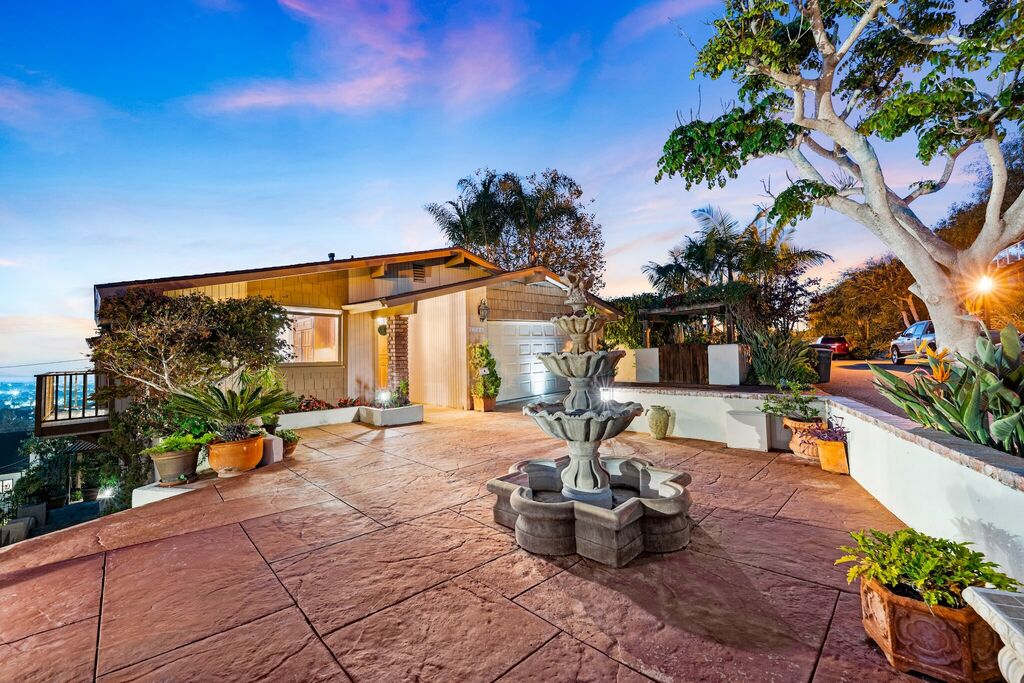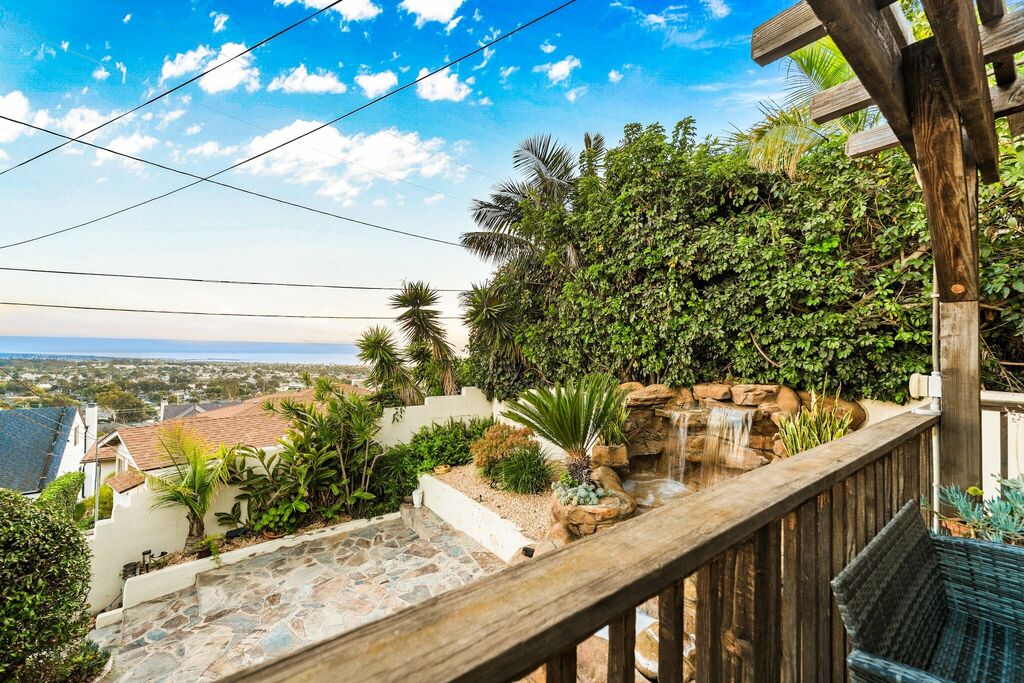 Perched above Ventura with panoramic views of the ocean, islands, and city below, this hillside home blends warmth, style, and comfort in every space. A gated courtyard with a bubbling fountain sets the tone as you enter. Inside, rich hardwood floors, vaulted knotty pine ceilings, and exposed beams frame the open living space, where large windows draw in the sweeping coastal views. The living room features a classic brick fireplace and a balcony perfect for morning coffee or sunset views.