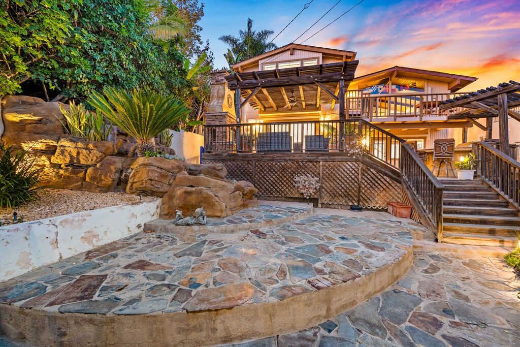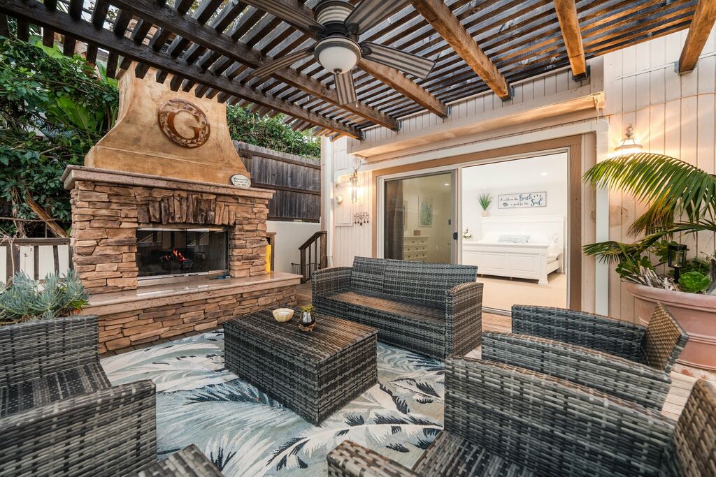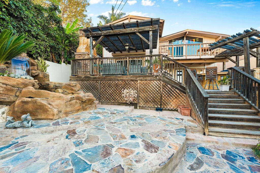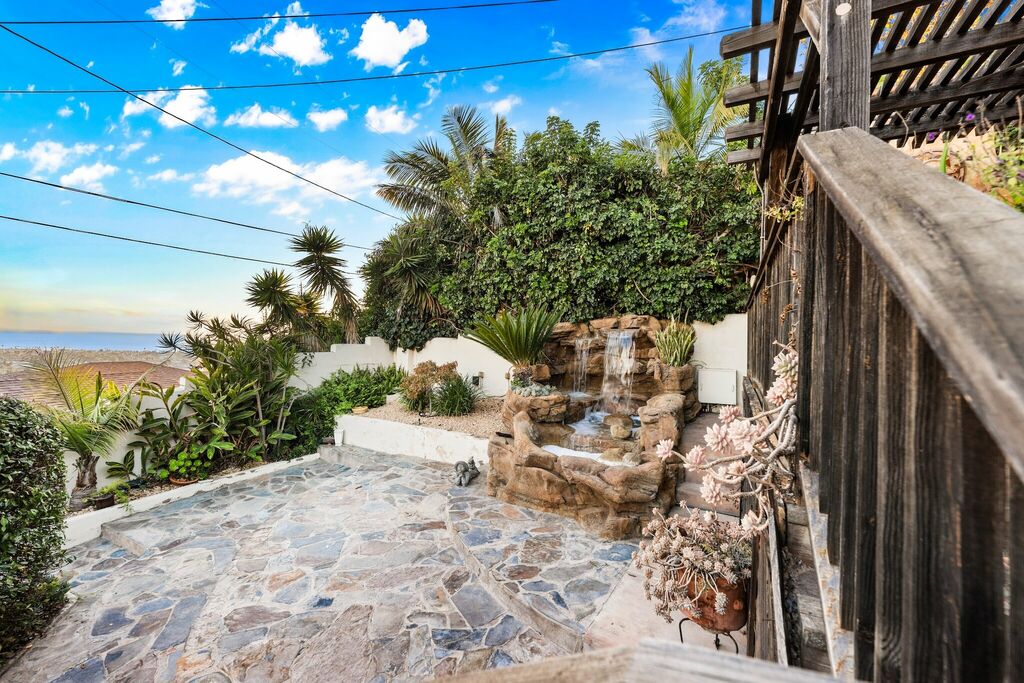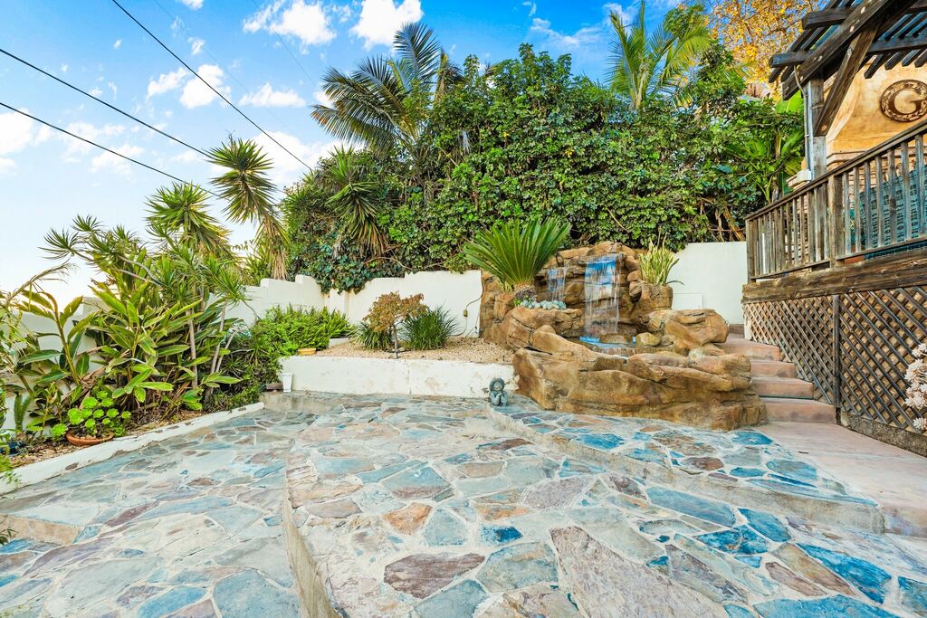The backyard feels like a hidden garden oasis, complete with stone pathways, a waterfall feature, and a wood-burning fireplace that invites you to linger after sunset.