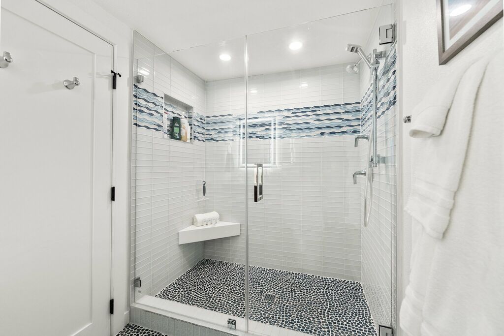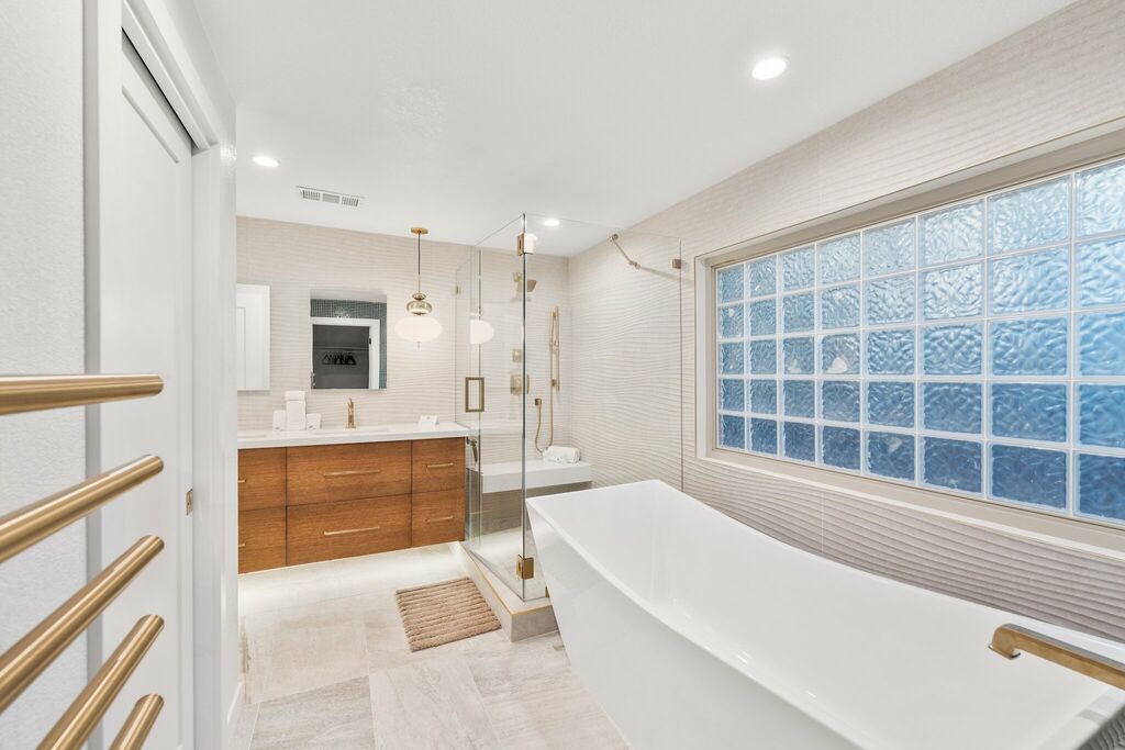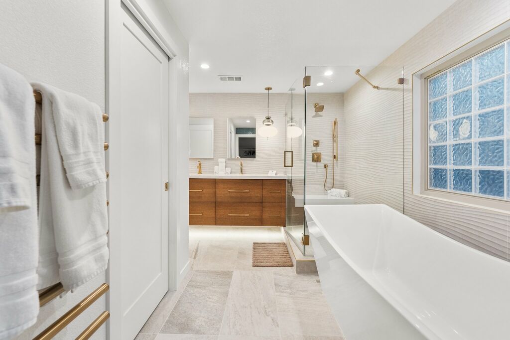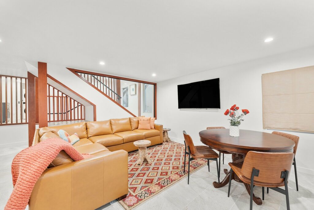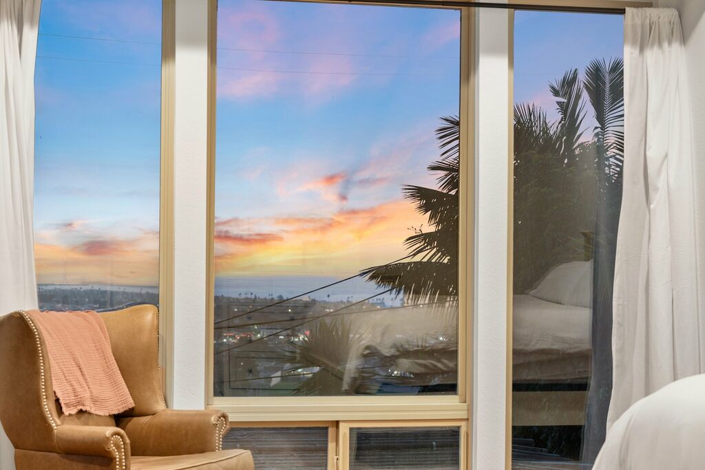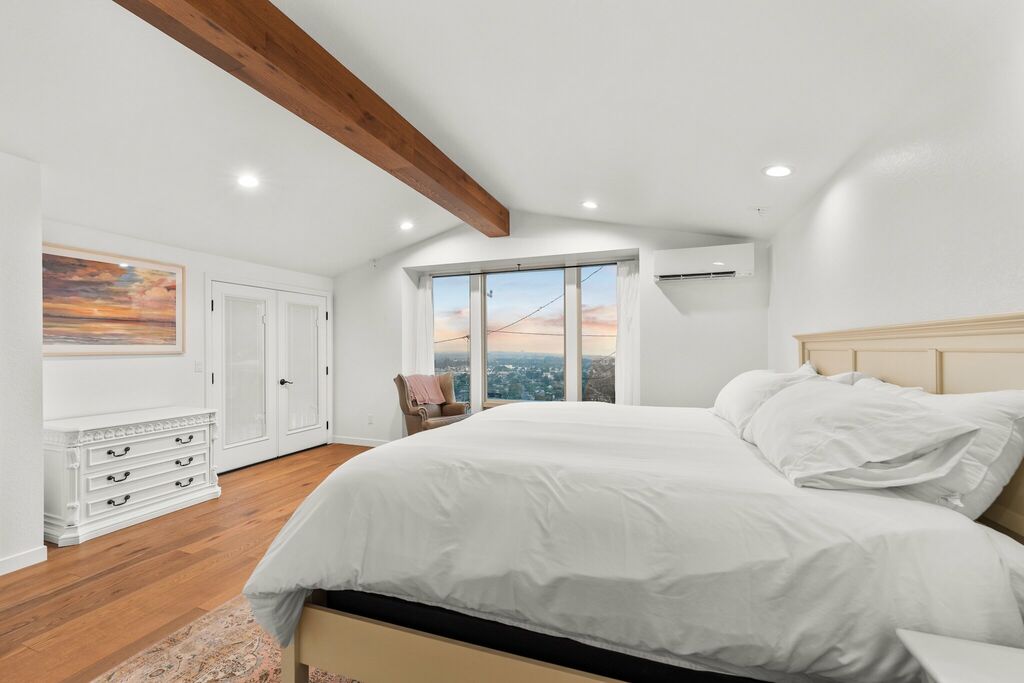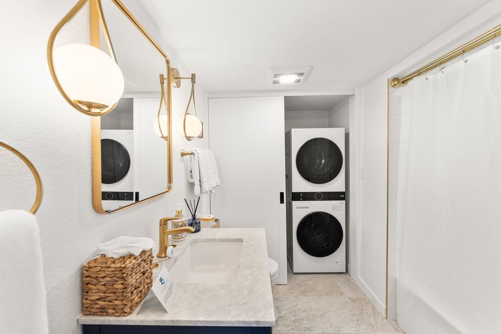 The upgraded kitchen includes high-end appliances, custom cabinetry, and a central island, opening seamlessly to the dining area — ideal for relaxed gatherings and easy conversation. The primary bedroom w/king bed is located on the main floor, captures breathtaking views and includes private balcony access for enjoying city lights at night. Its adjoining bathroom offers a spa-like escape with marble finishes, a jet tub, and a step-in shower.