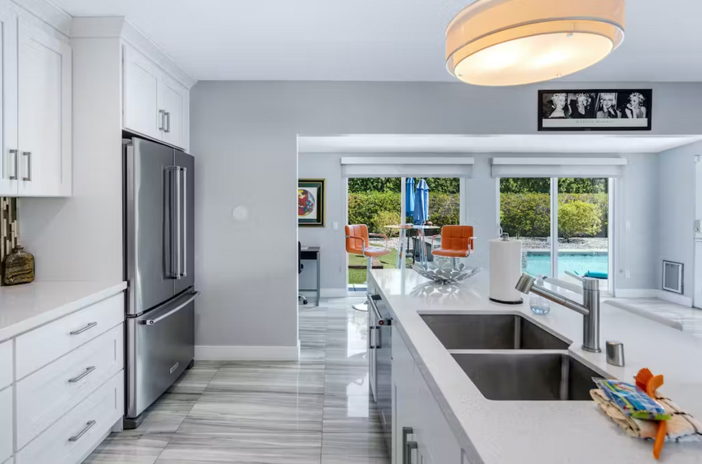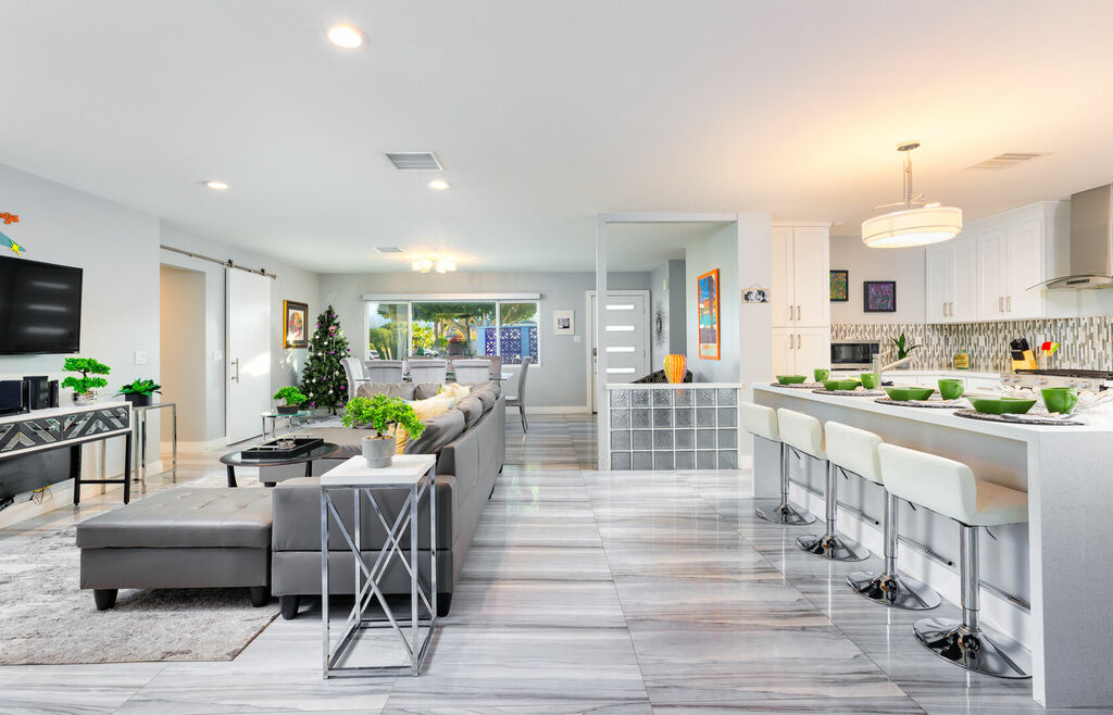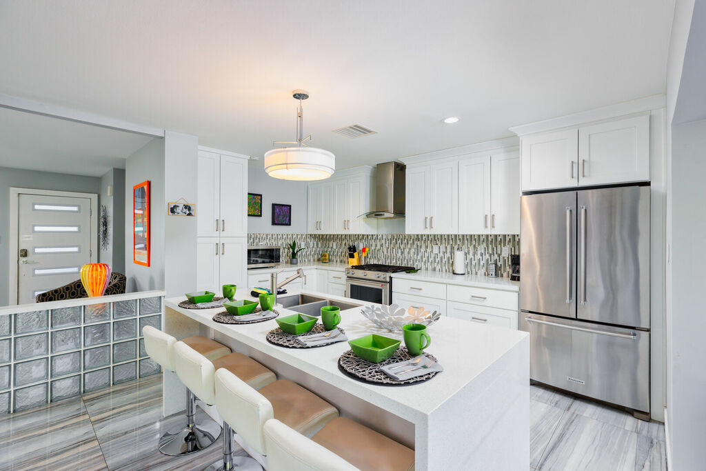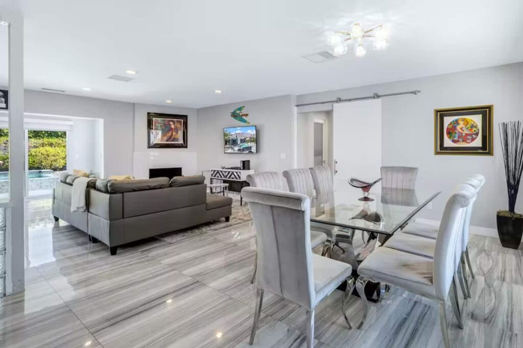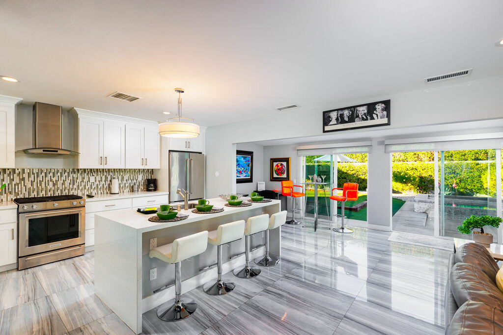 The gourmet kitchen showcases quartz countertops, stainless steel appliances, and a gas range. Create culinary masterpieces or sip a martini at the bar while engaging with the chef. Adjacent, a nook provides a serene space before meals. Gather at the elegant dining table for eight, indulging in delicious meals and animated conversations.