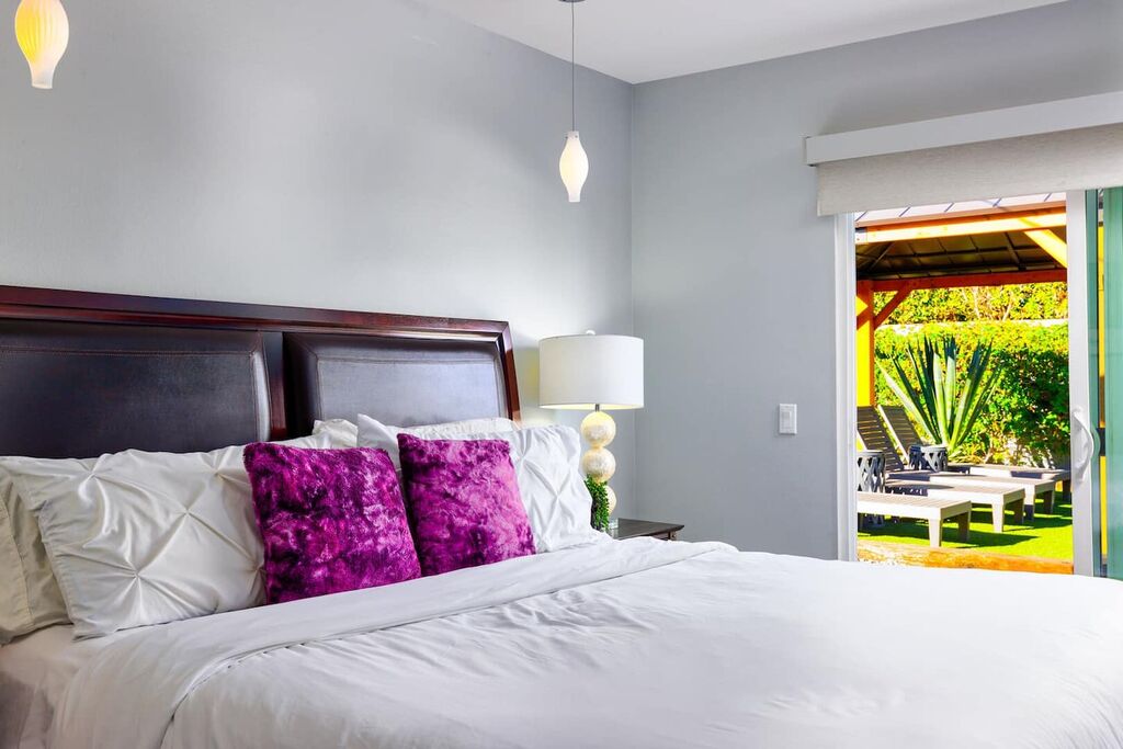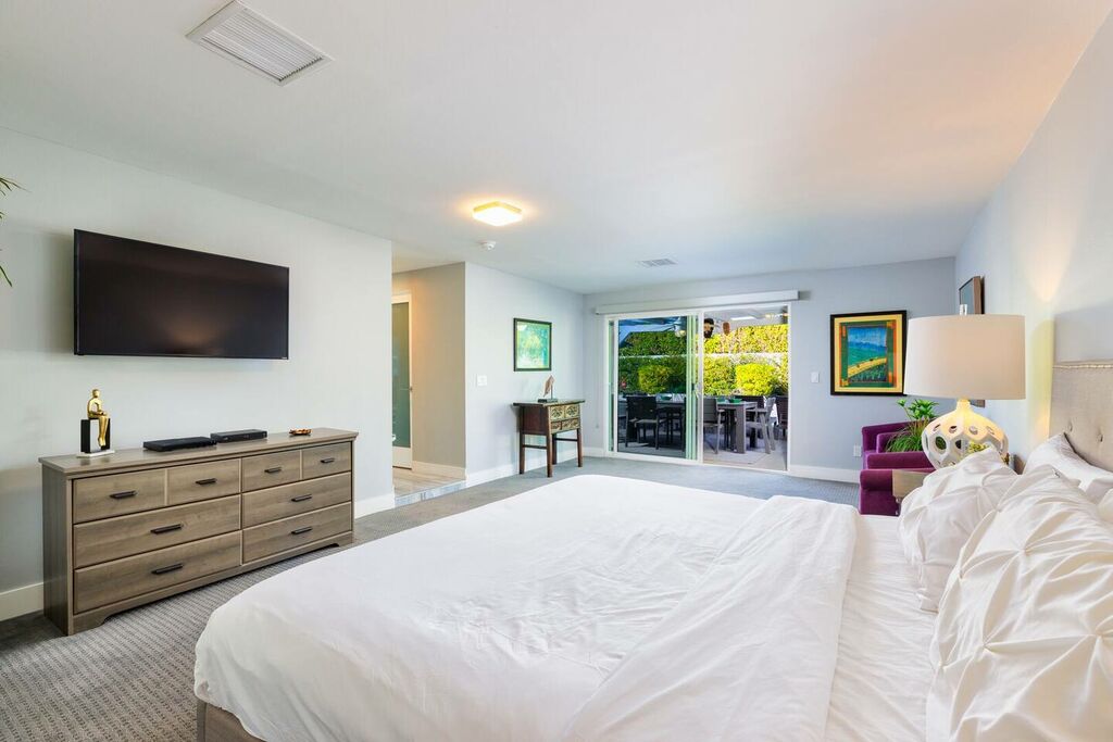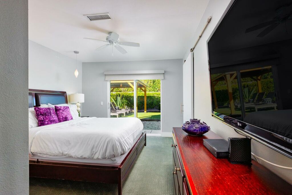 The primary suite includes a king bed, TV, backyard access, and an en-suite with a walk-in shower.