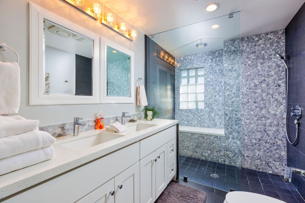 Two additional guest rooms, one with a full bed, the other with a queen, each feature TVs and share a bathroom with a walk-in shower.