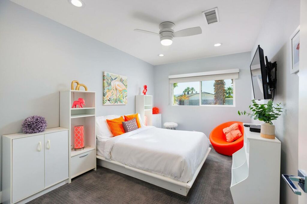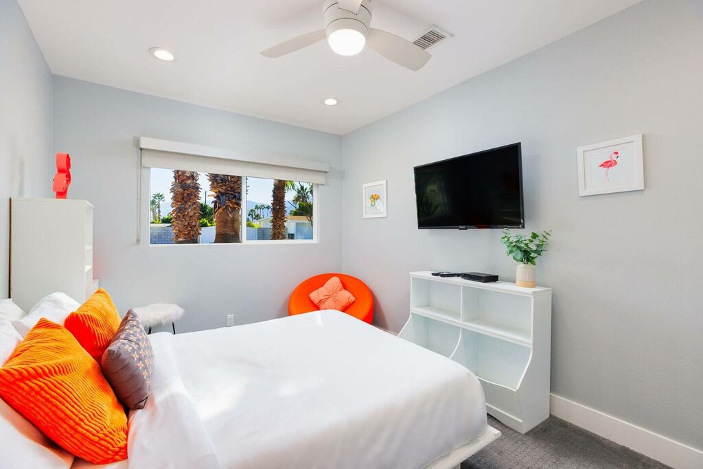 Situated at the opposite end, the second suite offers a king bed, 50in TV, pool access, and two chic orange lounge chairs. Its en-suite bathroom boasts a dual vanity and stylish walk-in shower.