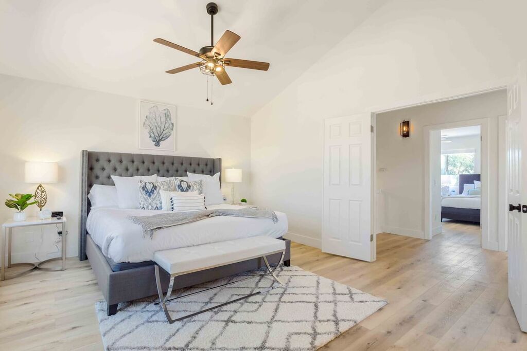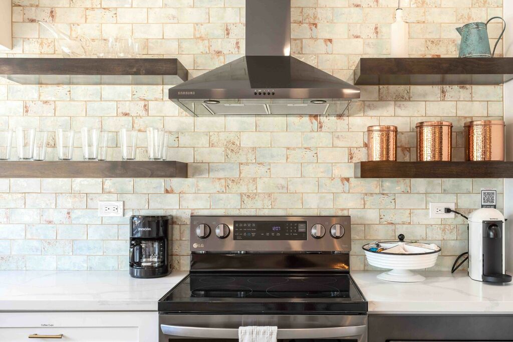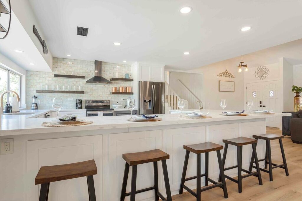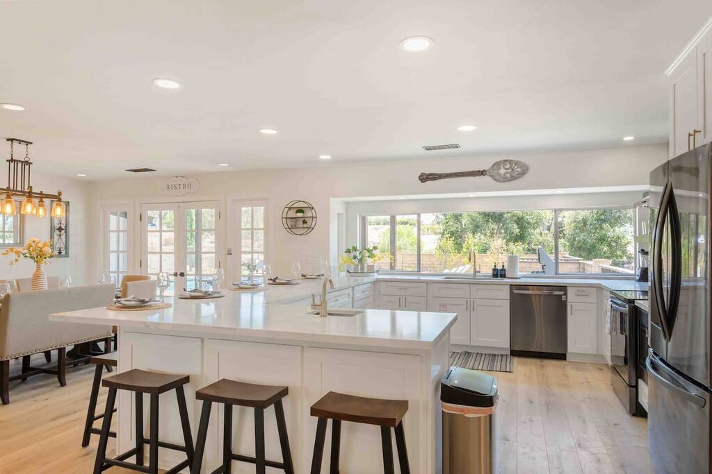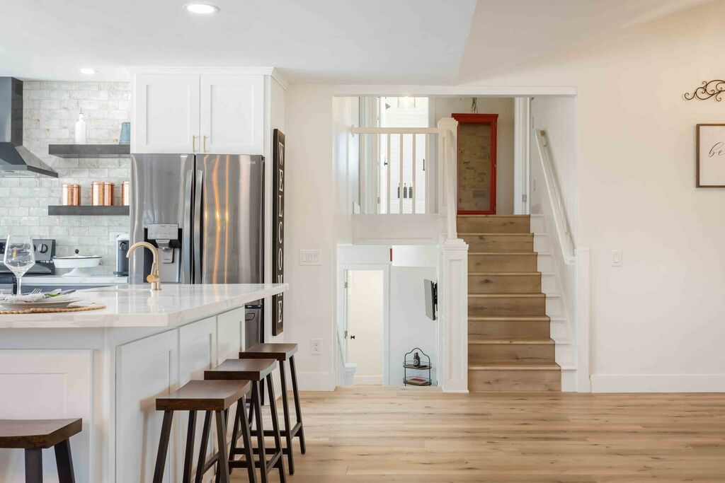 The main level features an entertainer’s kitchen stocked with cooking essentials and an open floor plan that flows easily into the dining and living areas. Guests can move between spaces comfortably, whether preparing meals, topping off drinks, or enjoying time together.