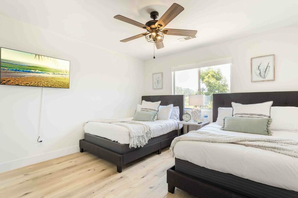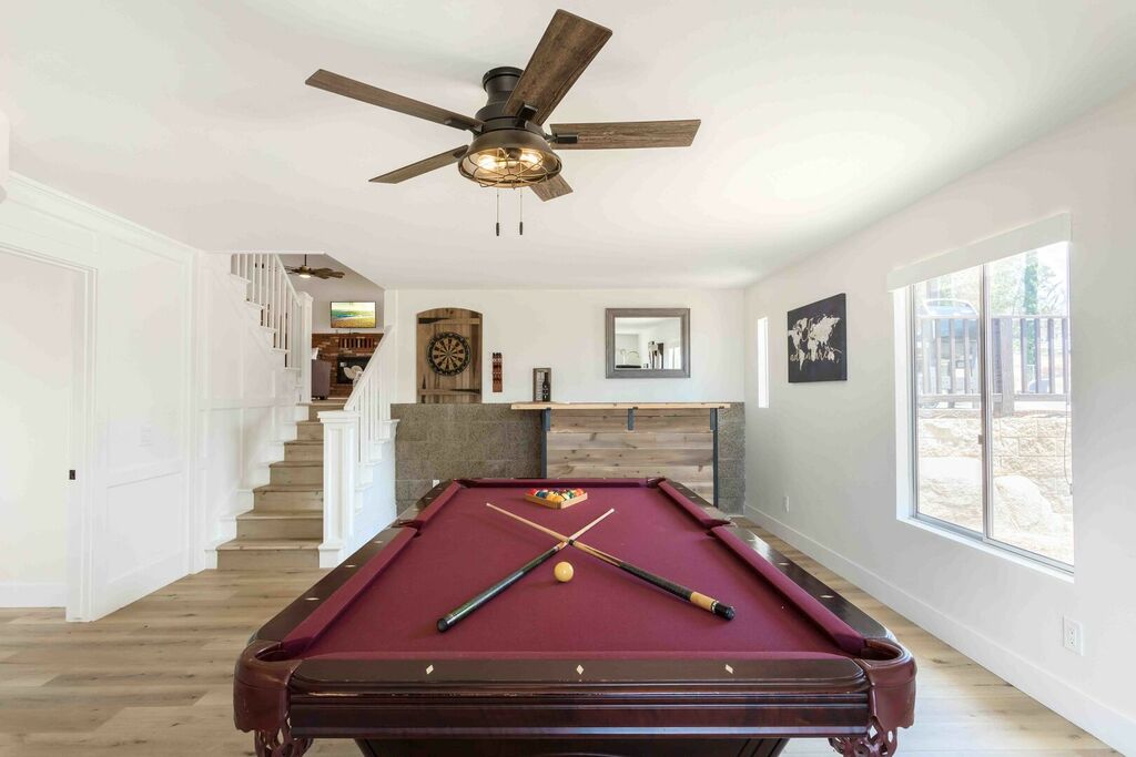 Downstairs, you’ll find a game room with a pool table, darts, and a custom bar, along with the master suite featuring a retreat area perfect for morning coffee or quiet downtime. Upstairs are three additional bedrooms: one with a king bed, one with a queen bed, and one with two full beds.