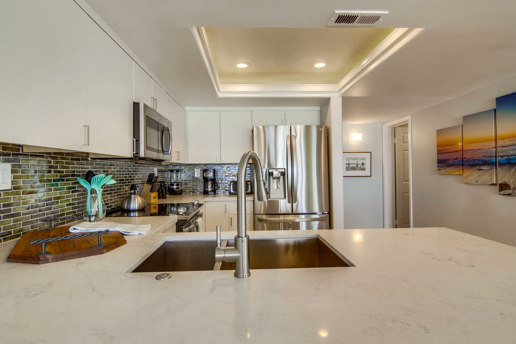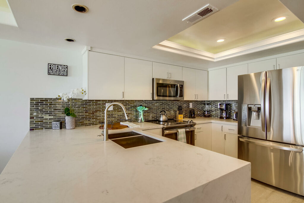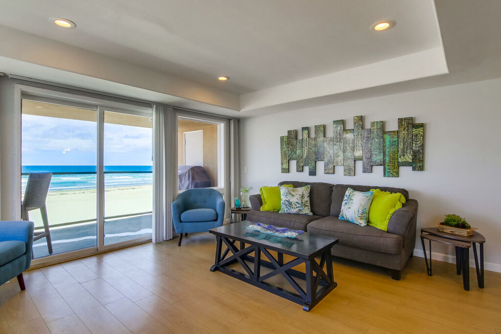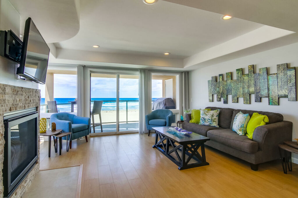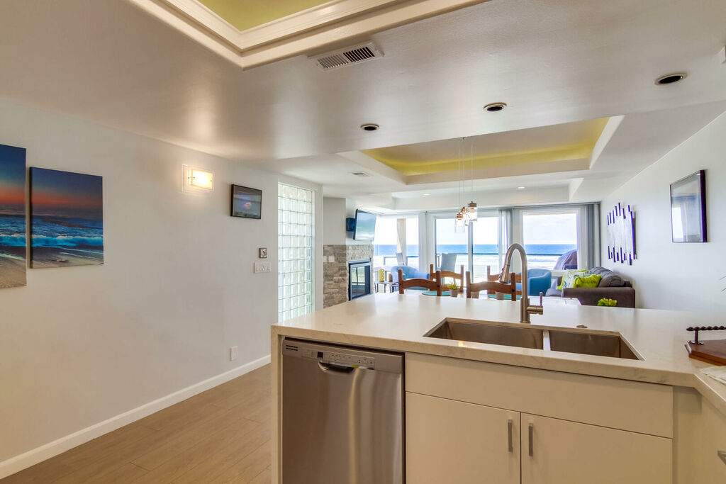 Enjoy a relaxing oceanfront getaway in this beautifully updated two-bedroom, two-bath condo in Mission Beach. Located on the second floor just steps from the sand, the condo offers stunning ocean views from the open living, kitchen, and dining areas. Step out onto the private balcony with a propane BBQ grill to enjoy meals while listening to the waves and soaking up the sunshine. The living room features cozy seating, a flat-screen cable TV, and a gas fireplace, creating the perfect spot to unwind after a day at the beach. The modern kitchen is equipped with stainless steel appliances, marble countertops, a drip coffee maker, and a blender, with seating for three at the counter to gather with family or friends.
