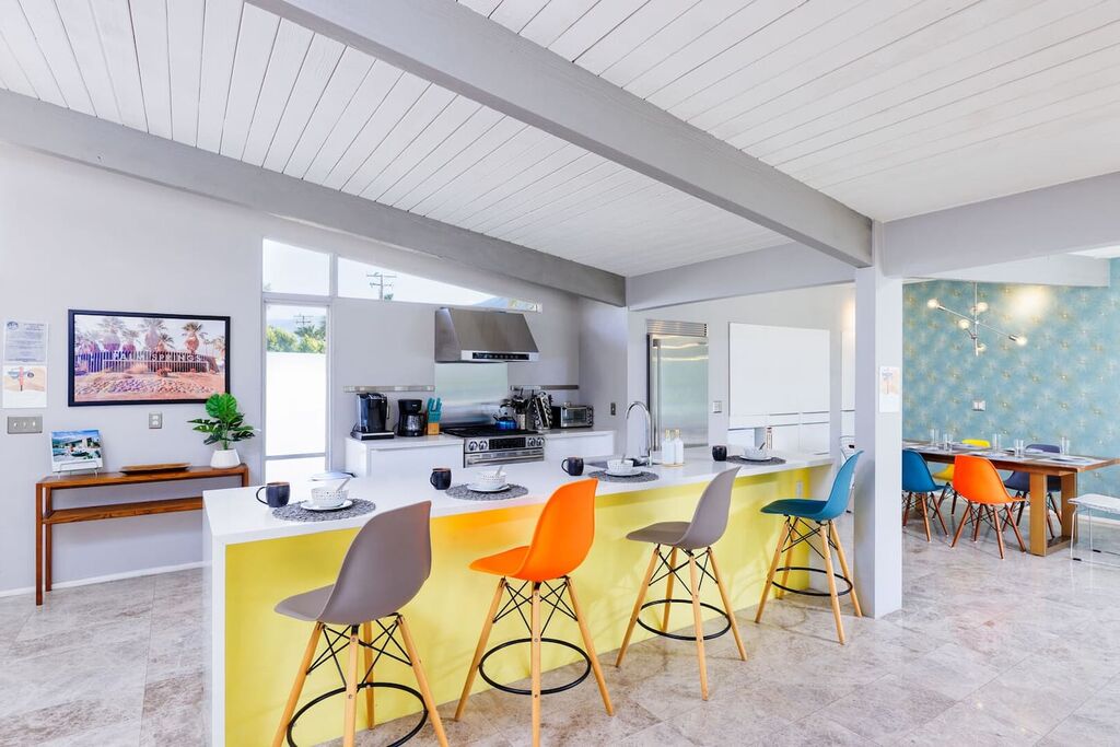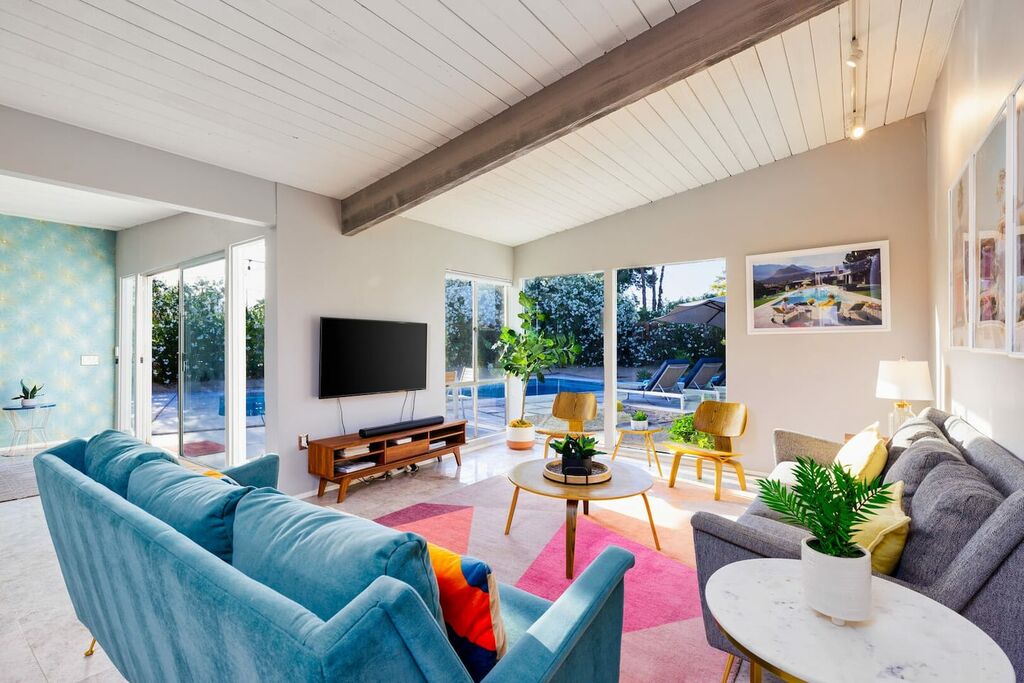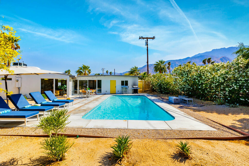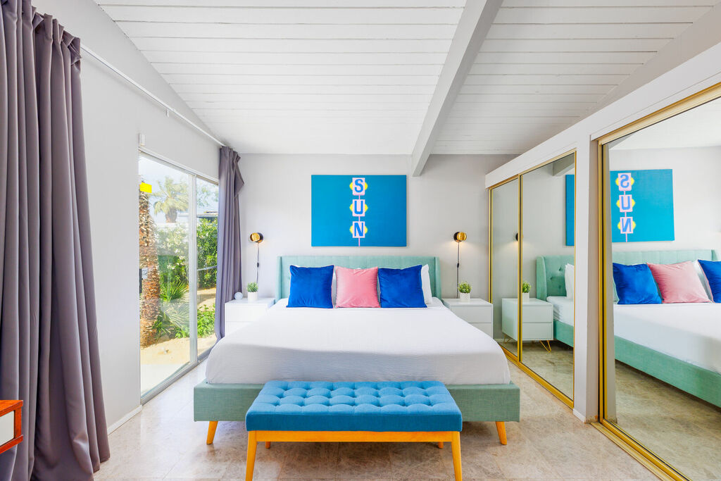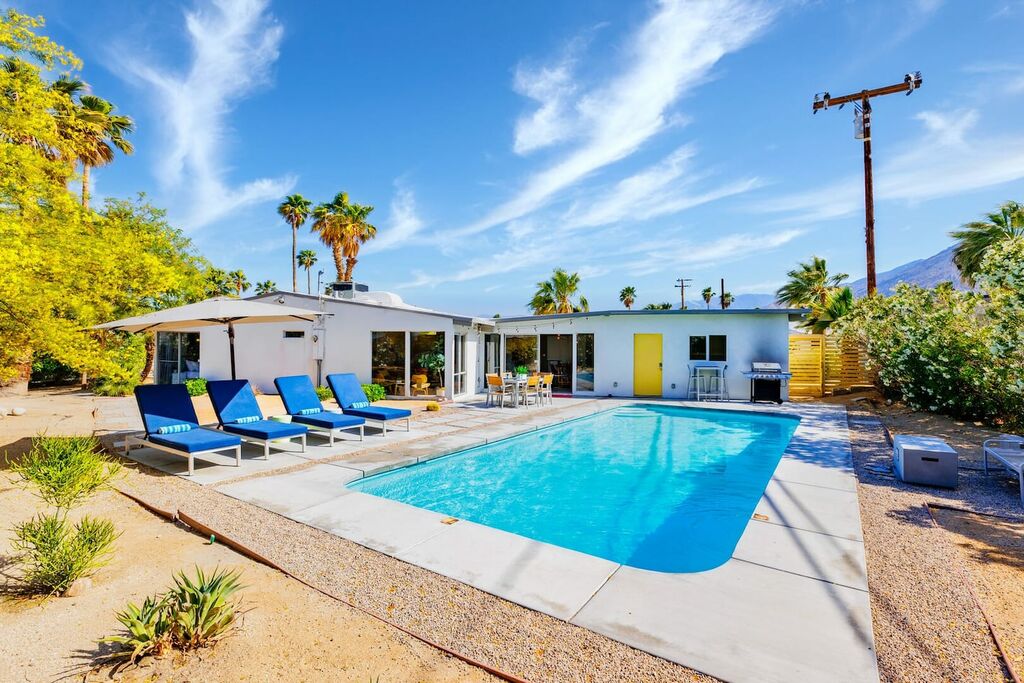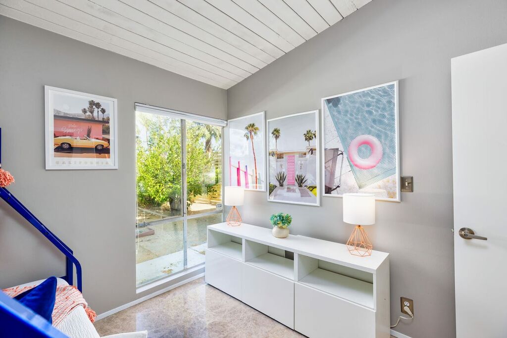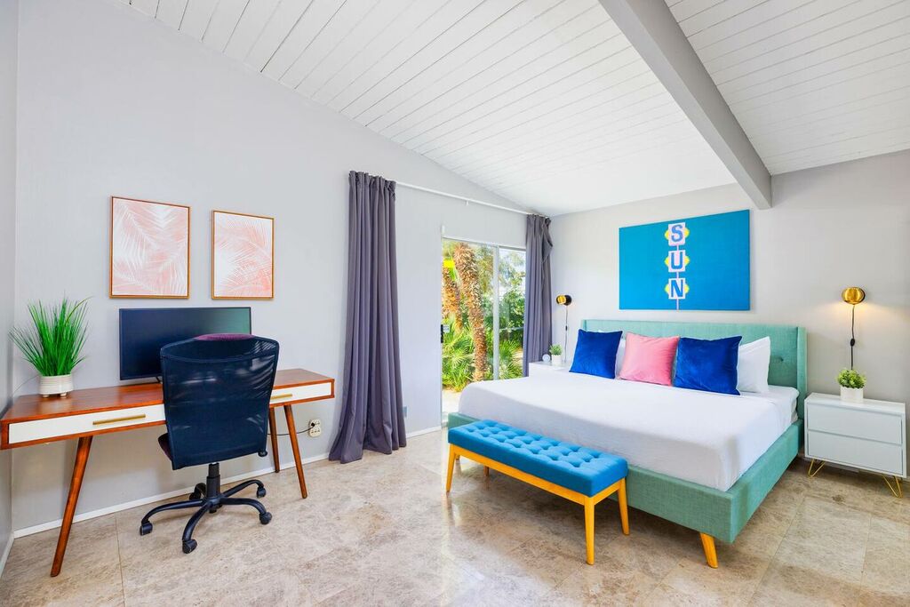 The flowing, open interior features a welcoming layout with stylish decor and iconic Palm Springs imagery. High-grade, stainless steel appliances come equipped for gourmet meal inspiration, while the sleek, uncluttered design makes for seamless prep and cleanup. Grab a spot on one of the sofas to stream your favorite shows and movies on the smart TV, or kick back in the sitting area with a good book to enjoy some quiet reading. Master bedroom guests will enjoy private en-suite bathroom access and a dedicated desk in the bedroom for remote work convenience.