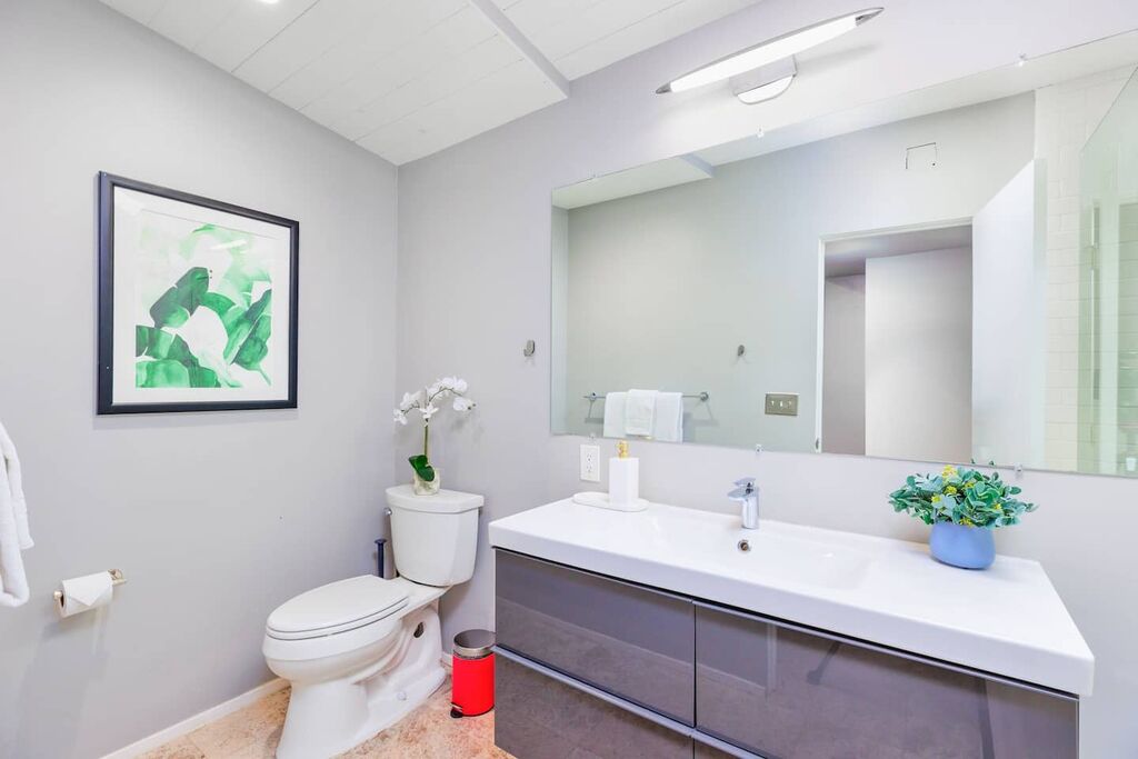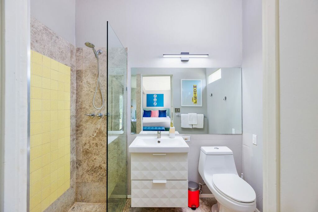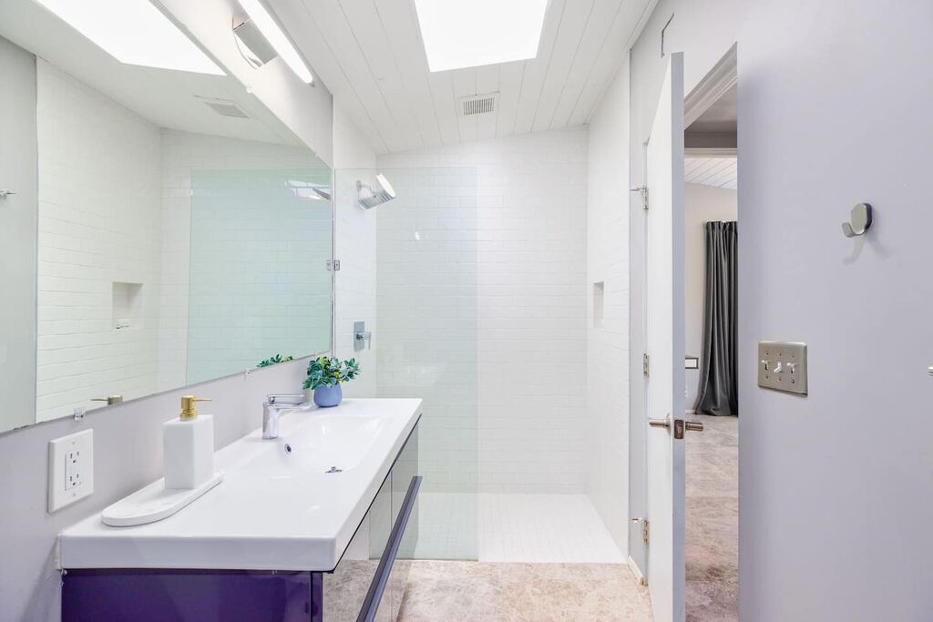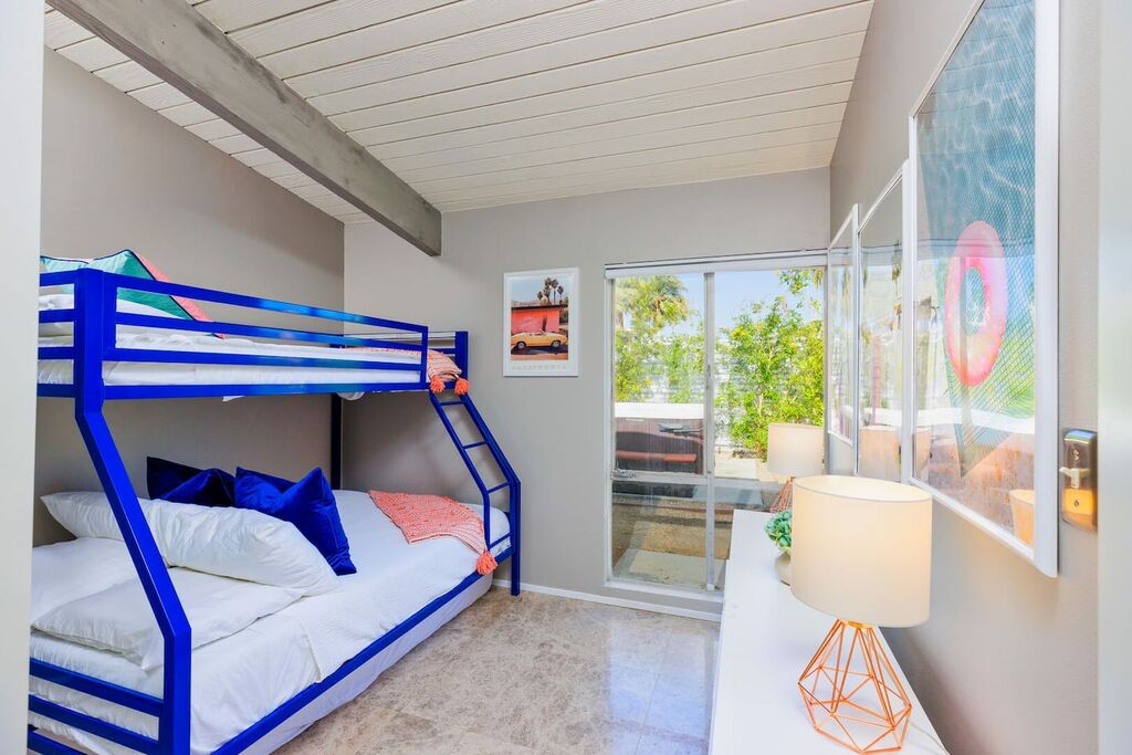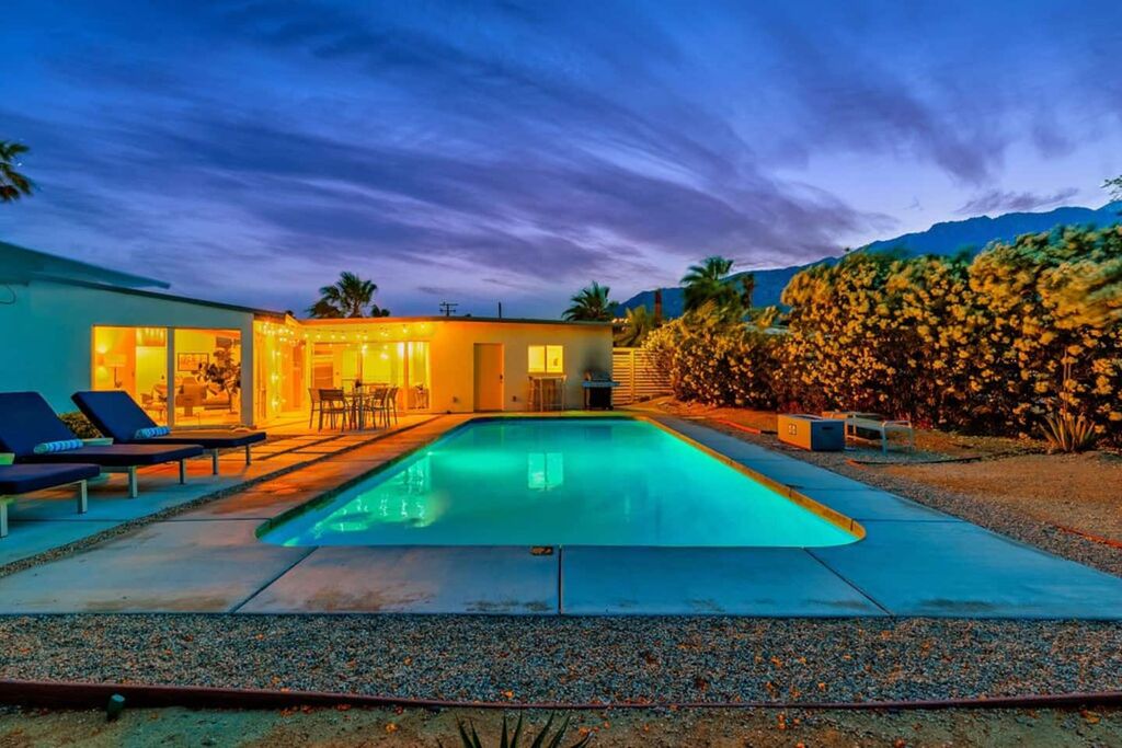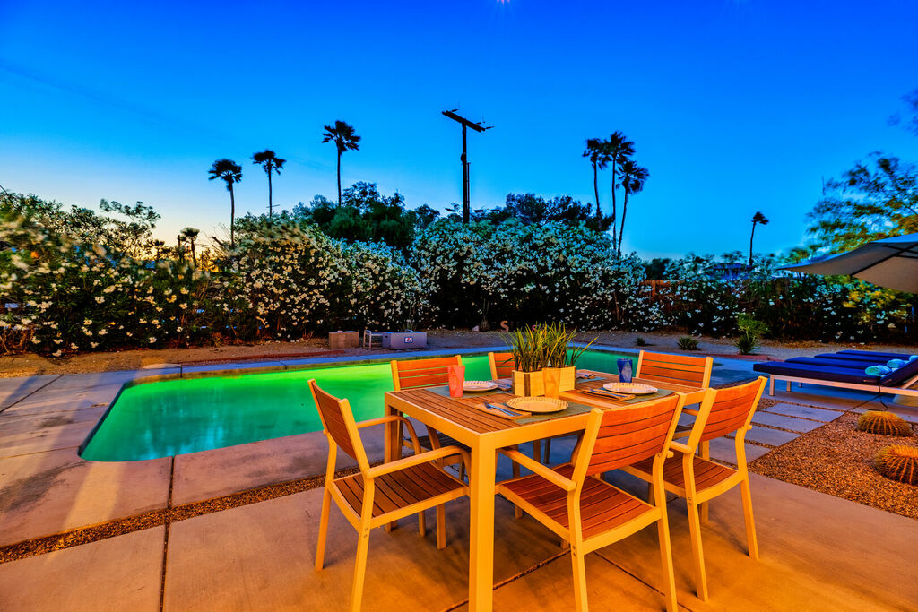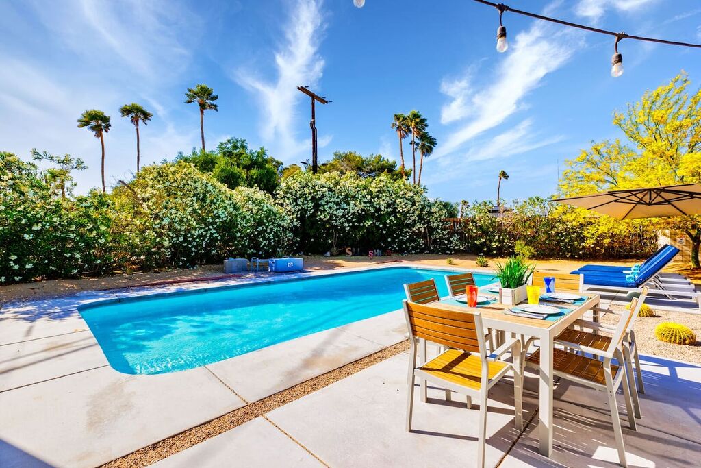 The flowing, open interior features a welcoming layout with stylish decor and iconic Palm Springs imagery. High-grade, stainless steel appliances come equipped for gourmet meal inspiration, while the sleek, uncluttered design makes for seamless prep and cleanup. Grab a spot on one of the sofas to stream your favorite shows and movies on the smart TV, or kick back in the sitting area with a good book to enjoy some quiet reading. Master bedroom guests will enjoy private en-suite bathroom access and a dedicated desk in the bedroom for remote work convenience.