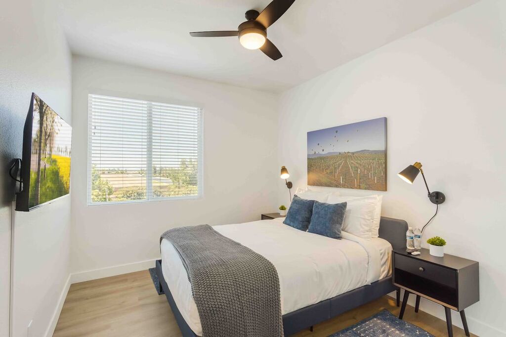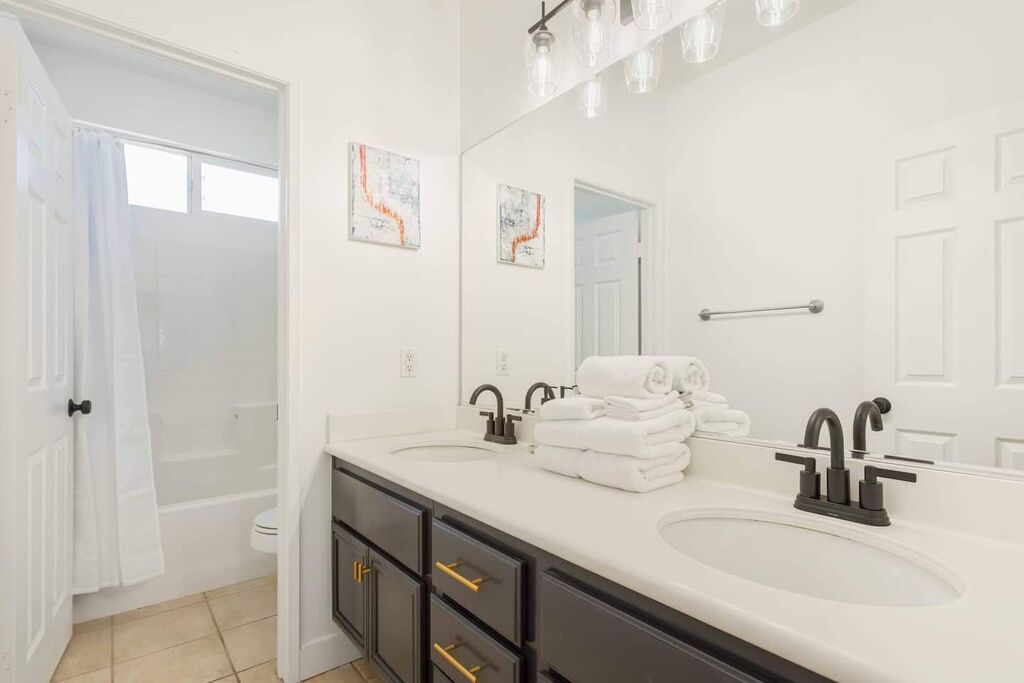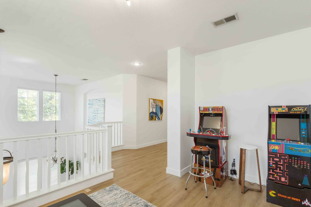 Our Wine-cation has a downstairs bedroom and bathroom. Upstairs you will find the other 3 bedrooms and 2 bathrooms all featuring hotel style linens, shampoo, conditioner, and soap. While your upstairs, you can kick your inner competition up a notch in our game room, adorn with vintage arcade games along with a large gaming table located in the loft.