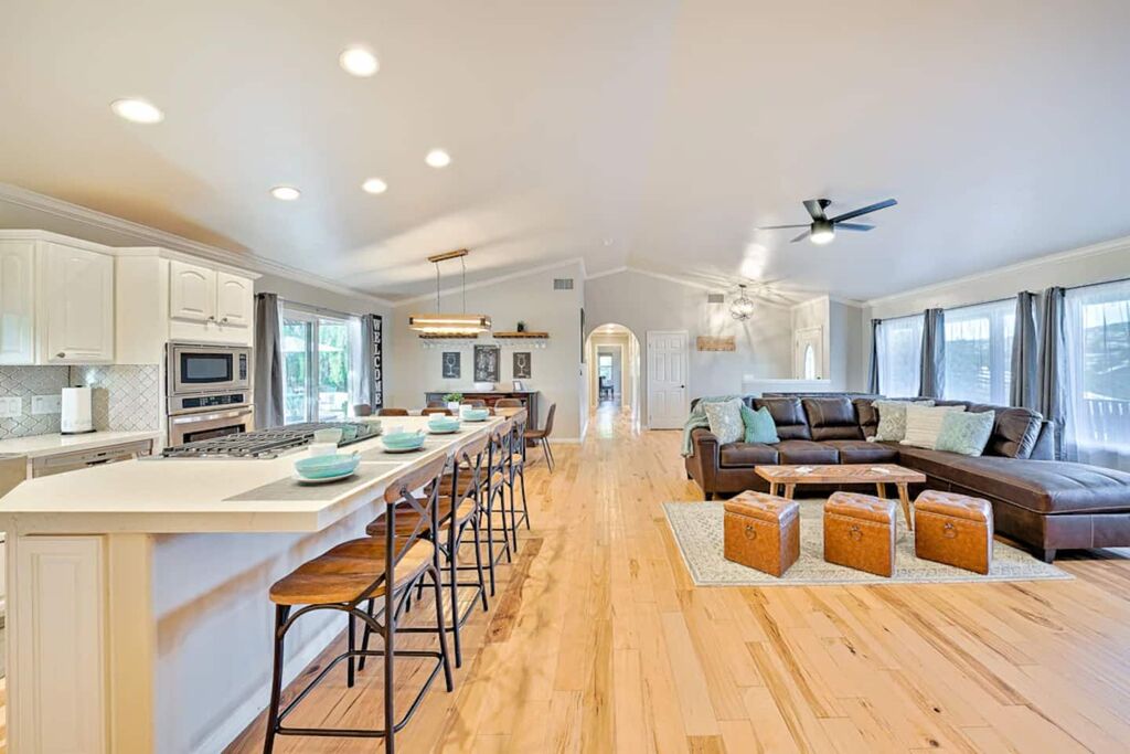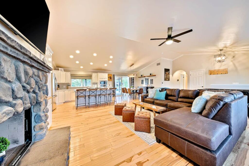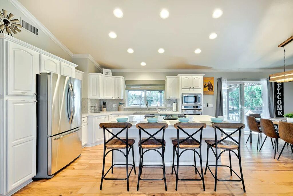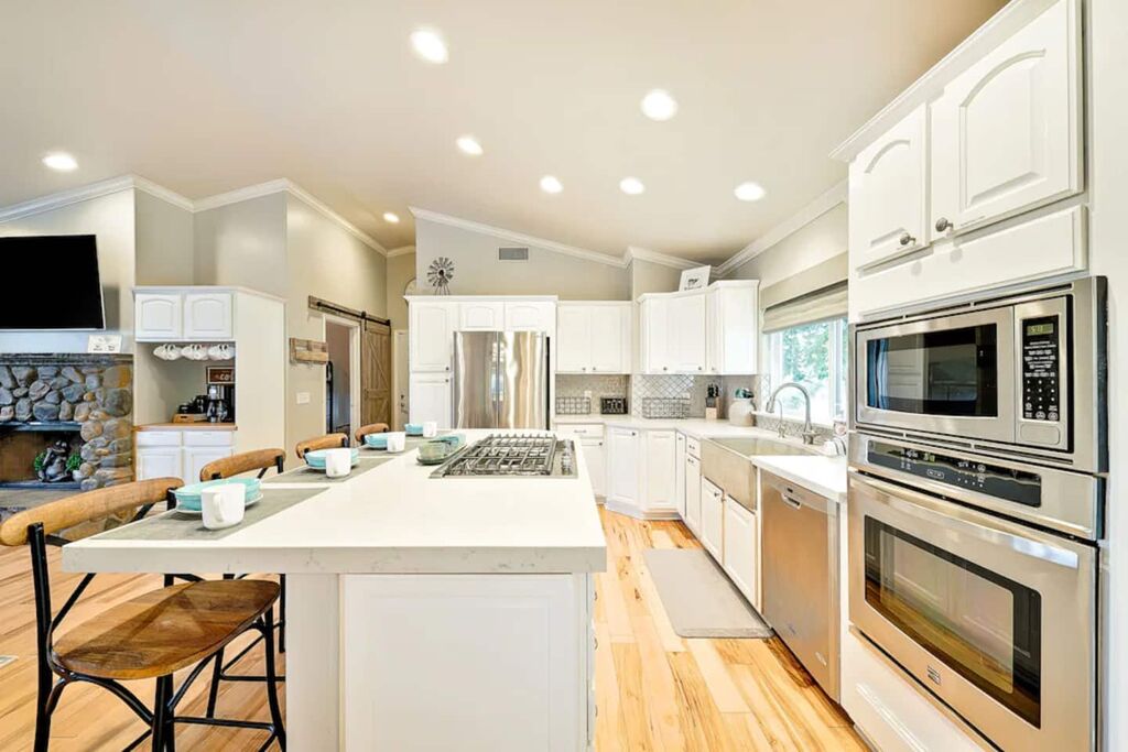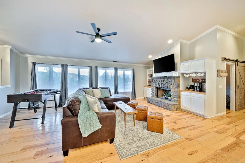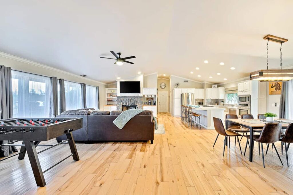 Step inside to find a spacious living area with comfortable seating, large windows, and a cozy fireplace. The fully equipped kitchen features high-end appliances, beautiful countertops, and ample cabinet space, making it easy to prepare delicious meals for your family and friends. The dining area seats 8 and there are 4 barstools at the kitchen island, providing plenty of space for everyone to gather. Adjacent to the living room, the foosball table provides hours of entertainment for guests of all ages.