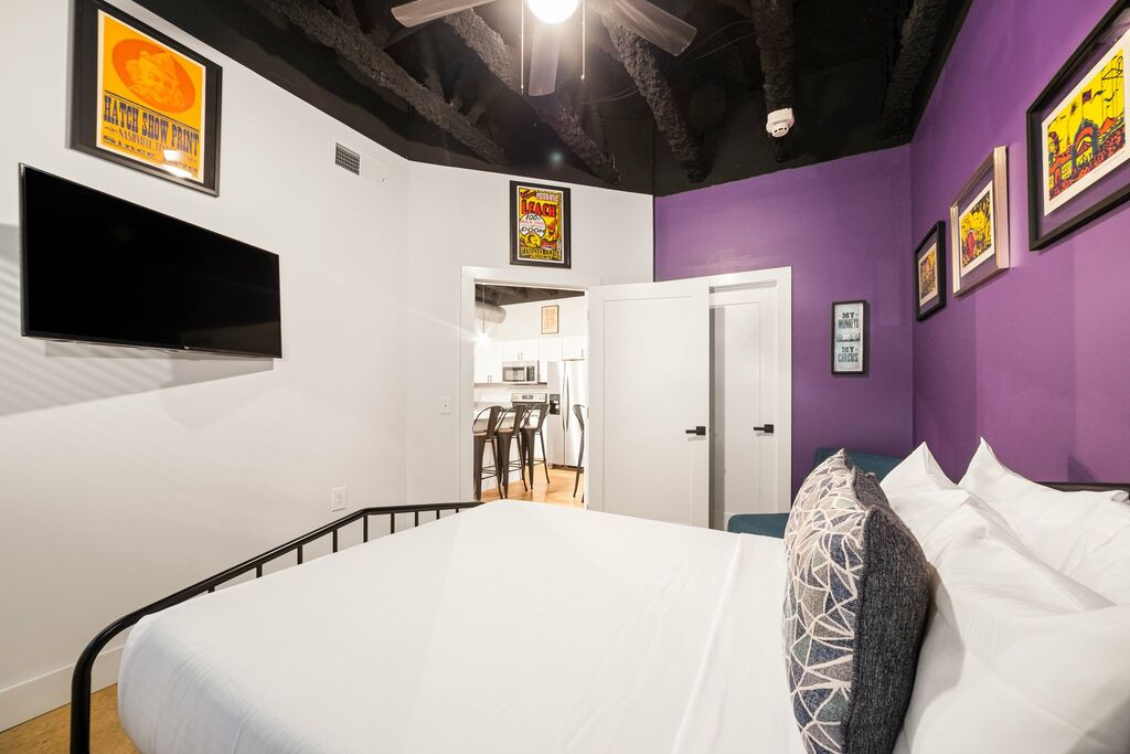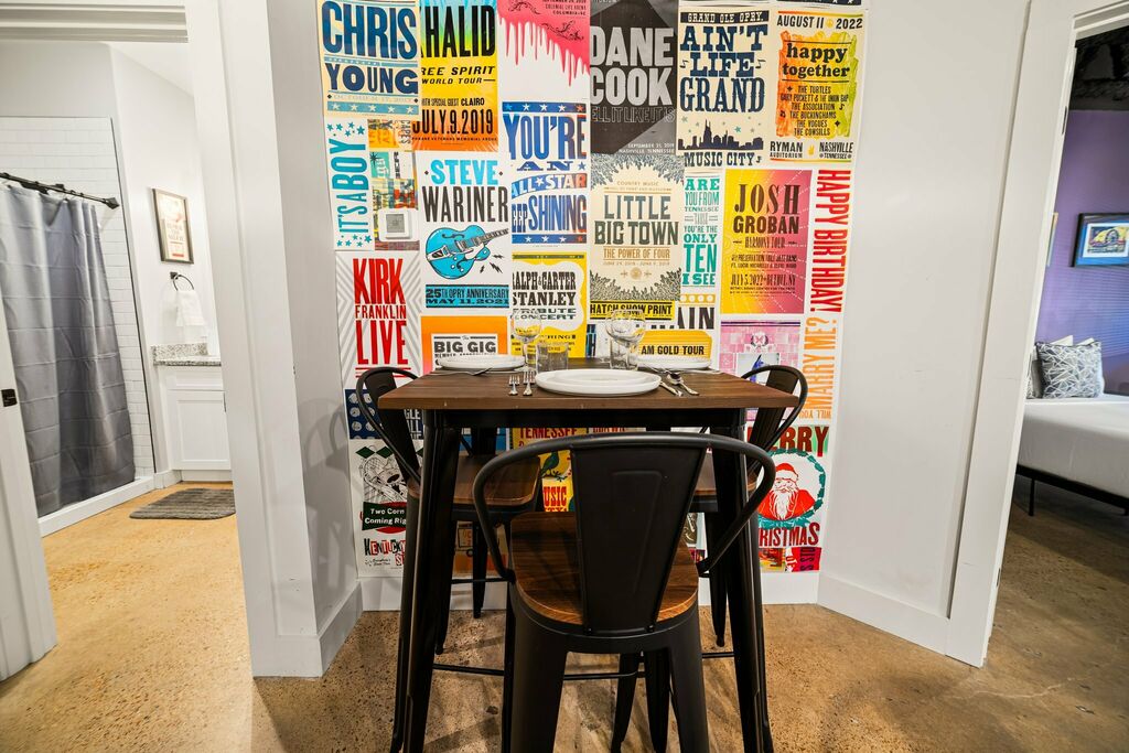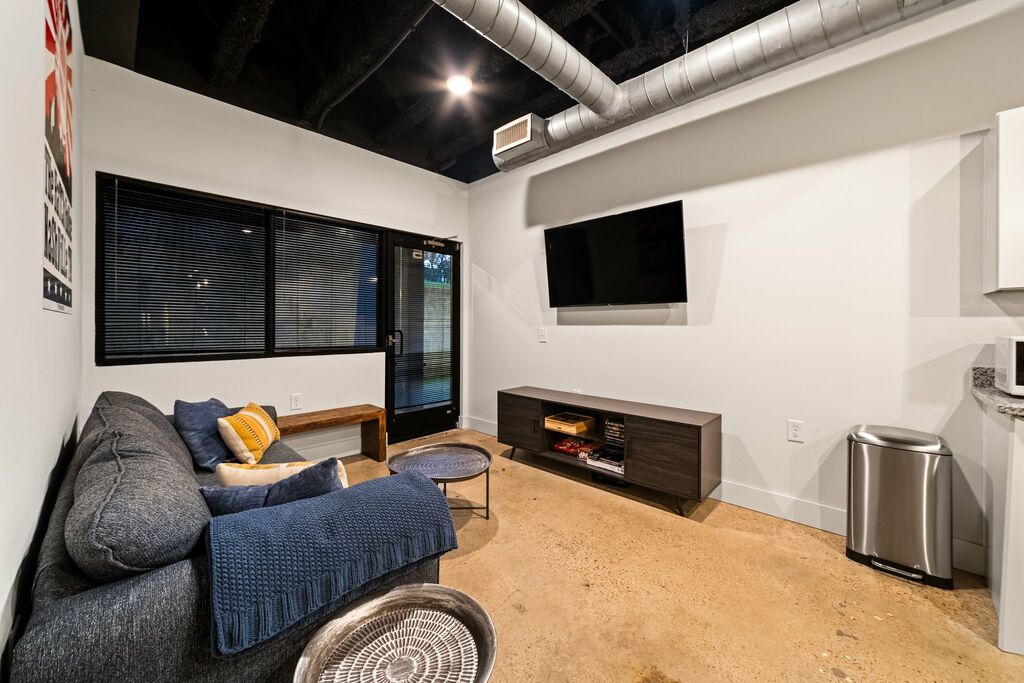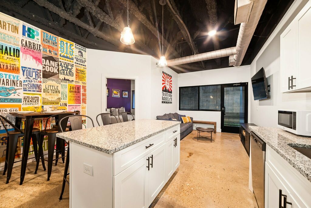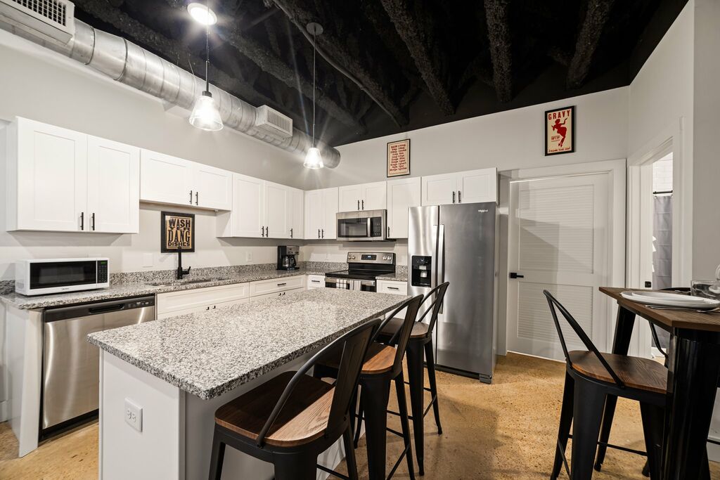 This one-bedroom, one-bathroom retreat combines sleek, modern design with a touch of Music City flair. Exposed piping and beams give the space an edgy, urban feel, while local Nashville signage and decor add a dash of hometown spirit. The spacious kitchen is a standout, featuring updated appliances, plenty of room to cook, and an island with bar seating—perfect for casual meals or gathering with friends.