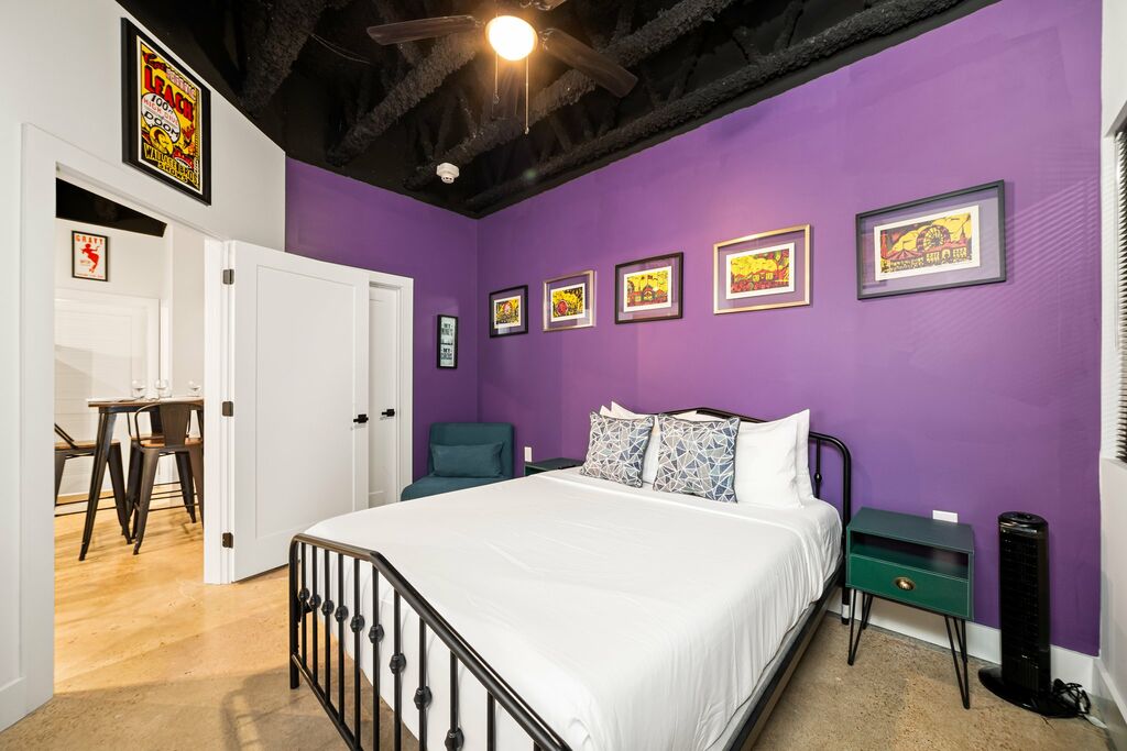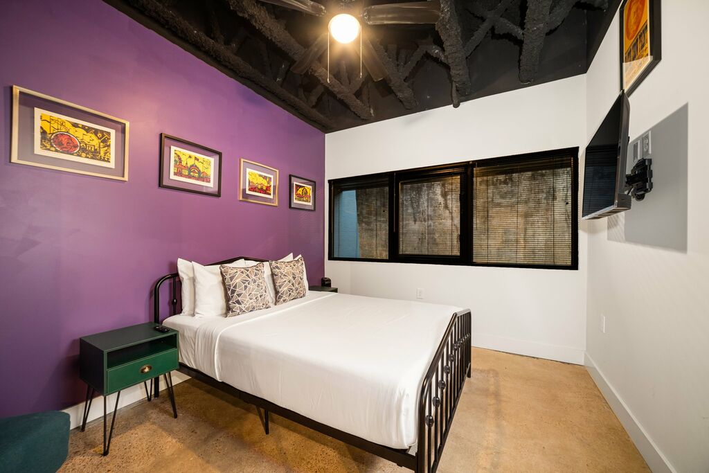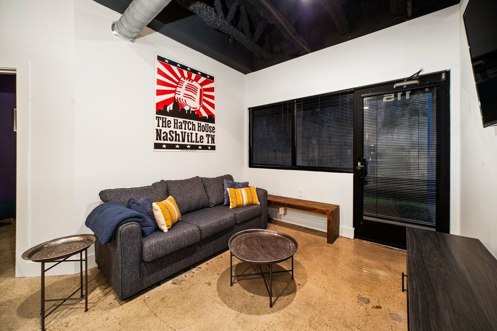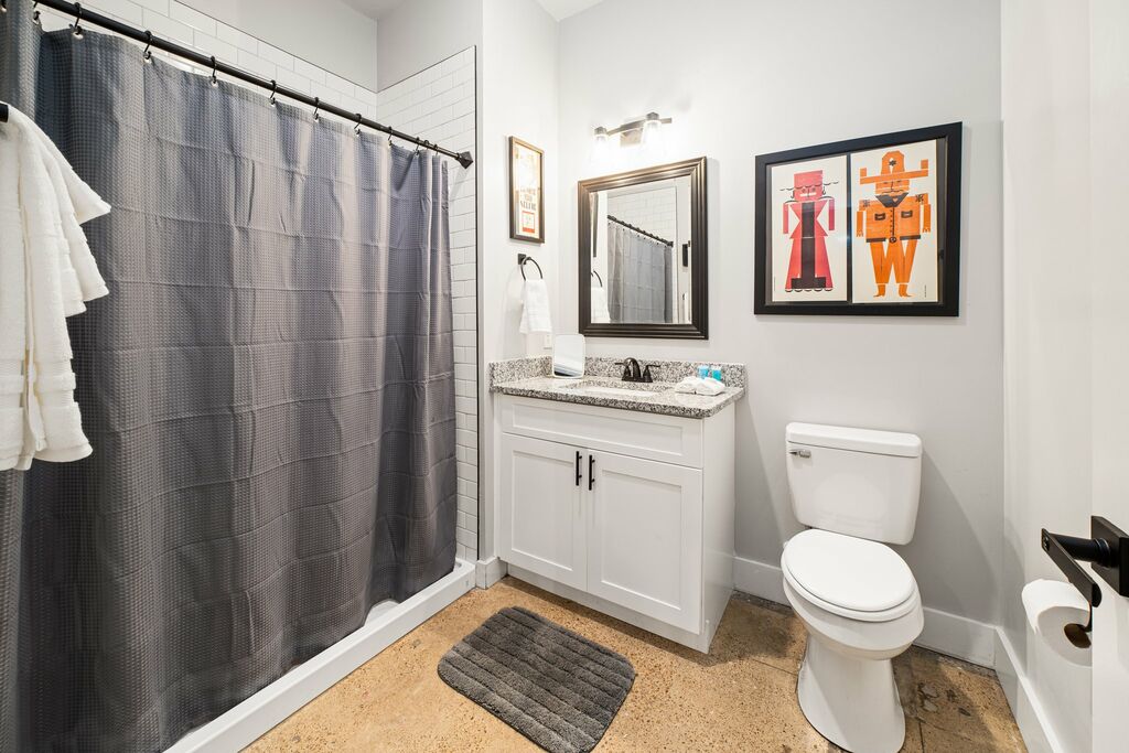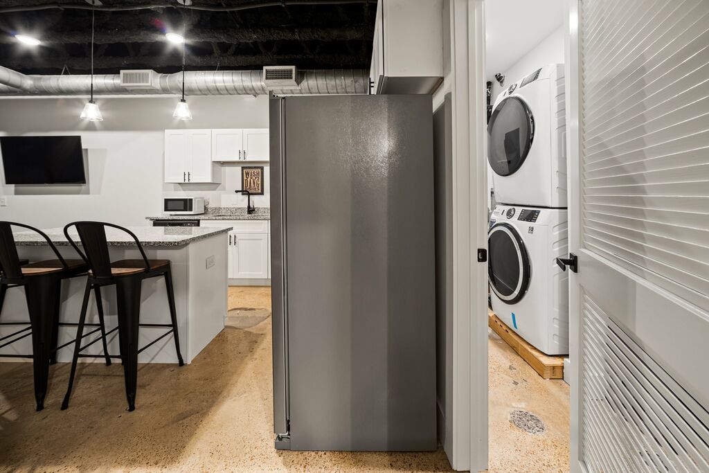This one-bedroom, one-bathroom retreat combines sleek, modern design with a touch of Music City flair. Exposed piping and beams give the space an edgy, urban feel, while local Nashville signage and decor add a dash of hometown spirit. The spacious kitchen is a standout, featuring updated appliances, plenty of room to cook, and an island with bar seating—perfect for casual meals or gathering with friends.